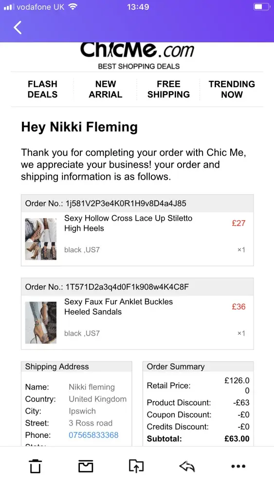 I ordered two outfits on line one was dress and one was shoes. I never got neither one. The shoe size was 9.5 n dress was large or medium. The dress was supposed to be gold and black and so were the shoes. The shoes had peep toe n some type of points or bullets all over them. I have a transaction number frum my card. It says it the money was srnt to Queens Road HK. Boutique Feel in the amout of 72.29. odered February 18. Transaction numberB6zQUPFMUIG