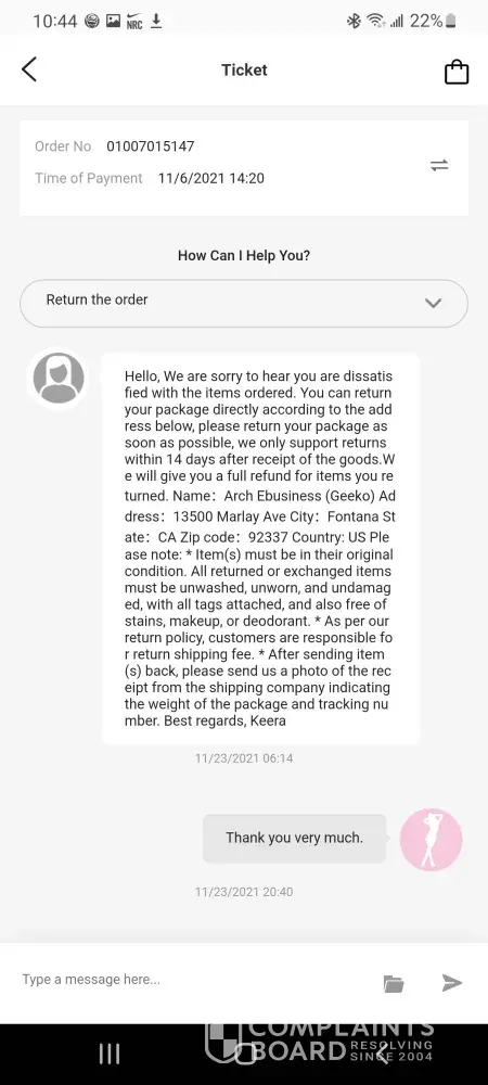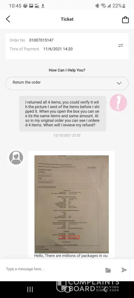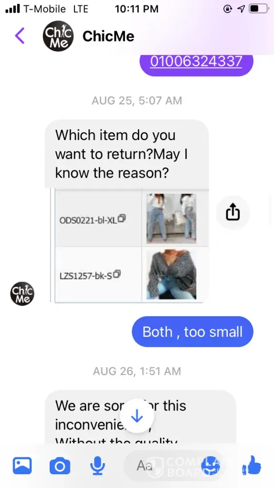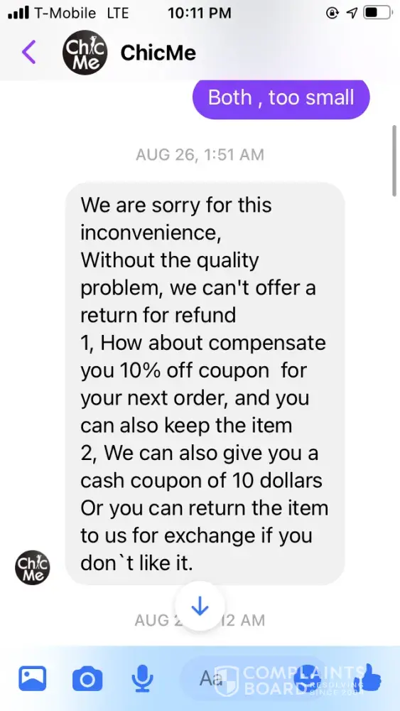 Ordered clothes from them that was my size, but when I got the clothes they were very small but supposed to be a large. I requested a refund because I knew I couldn't fit them just by looking at them… when I requested a refund, they said that I couldn't get my money back but I could get something else.. it's very hard to speak to anybody live and even in chat.. someone supposedly from the company was messaging me through Facebook messenger.. you can't get anybody to speak to at this clothing store or whatever it is.. I took my package to fed ex and got a tracking number and it appeared that the returns things were with them… I ordered something else and I've been waiting several weeks to get my items.. the person I've been talking to through messenger contacts me at all times in the middle of the night but shows this person be in Facebook during the day but won't respond to me until late at night…. This clothing store is horrible with bad customer service and bad quality/ too small clothing… I hate I purchased anything from them, this is very frustrating that I can't talk to anybody via chat or live..