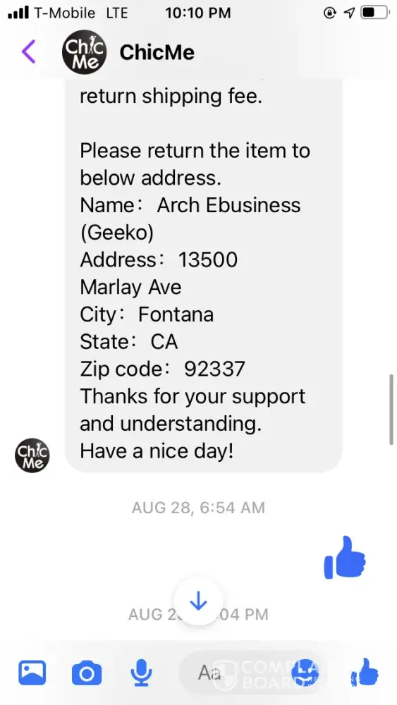 I purchased several items (7 to be exact) from this company because of the high ratings. However, when I got my items, the material was cheaply made and and very poor quality. I've email them and sent a refund request via their website. I originally was emailing Amiee and she was responsive the first email. After I explained to her I want to return all the merchandise because for all those reasons above, she then went MIA... I tried emailing several more times after that. I went through Amiee, Sally, and finally Cherry. When do get the finally get a response, they saying that I can't return it because it's past the 30 days. So this whole entire time, when it was in that 30 day period, ChicMe decides to not responds to my return request. Once when for sure it passes, you can't except it. I'm outraged by this poor business ethic and my purchase was over $100 that I just lost for no reason. Note: there is no return address that is provided on their website or order. You have to go through a request or talk to someone before all of that information is provided.