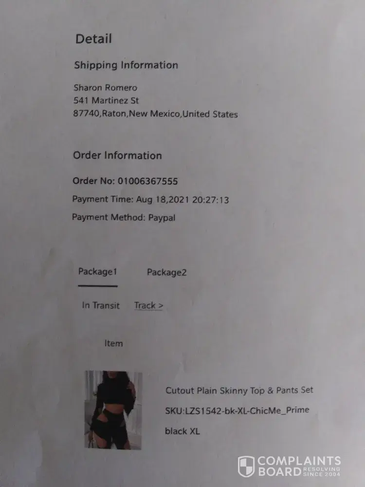 Very upset feel ignored I got no item I had to have PayPal issue a claim for amount 26.61 for cutout plain skinny top and pants set