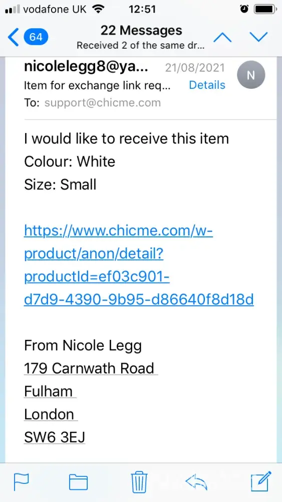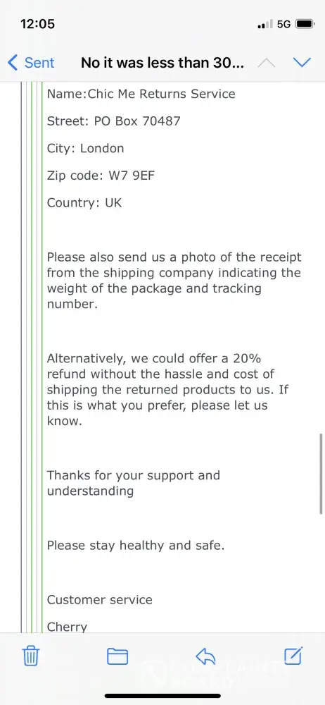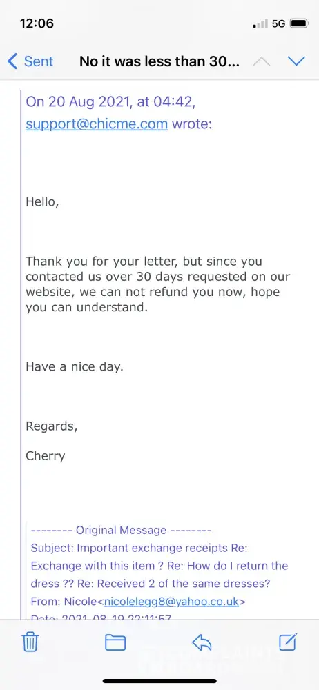 Wrote into Support at Chicme requesting a refund and then decided to go for an exchange. Received an initial email from Cherry who was very polite and helpful and then a very nasty cheeky email from Cherry saying that I cannot get a refund or exchange after they manipulated me into sending the dress back!? Wow! It was about 2 weeks ago that I first contacted them to get a refund and they are saying that since It had been over 30 days ago since I first contacted them regarding this matter that now they won't refund or exchange it? I have bought so many things from them as well. Terrible, total liers. I was in bed with Covid for a week self isolating and that's why It took me a bit longer to send it back but it was certainly not over 30 days. Awful