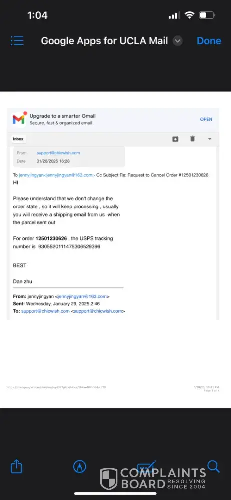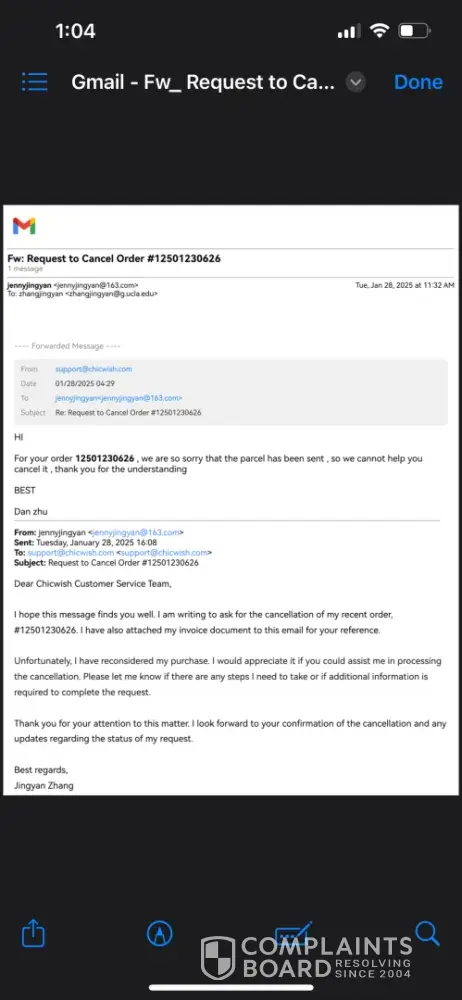 I placed an order with Chicwish on January 24, 2025, and requested to cancel it on January 28, 2025, while the order was still marked as “Processing.†Despite their policy allowing cancellations for unprocessed orders, my request was denied. Chicwish initially claimed that my parcel had already been shipped. However, this turned out to be untrue. The...