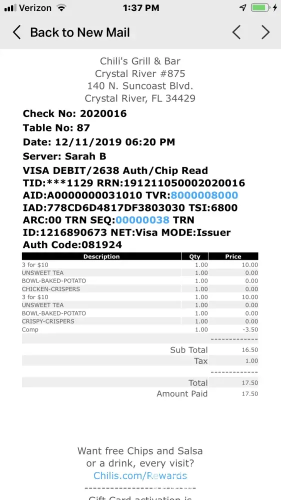 Chili charge me 4 time and said my card don't work I order on line I check my card they took 245$ off and sayn the card DNT work. I call my card people the said they took it 4 time and I have to call them they have me a run around they DNT see it in the system try toma ! Wat I have 5 kids if u DNT pay your light bill they not going to wait. I need my money asap!!!