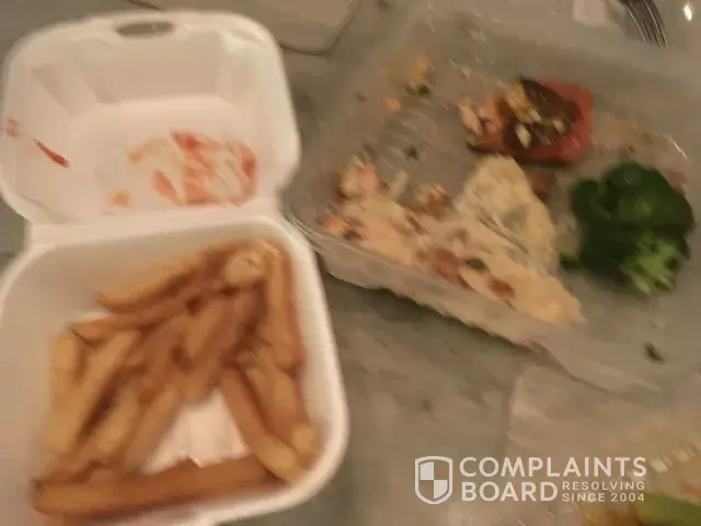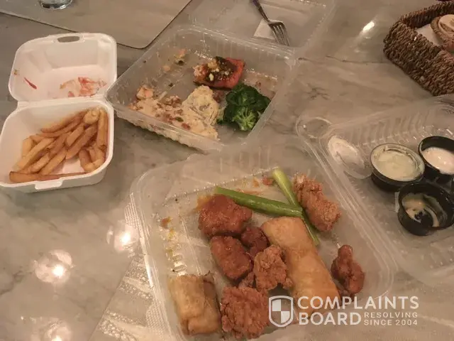 Read full complaintTake out food was overcooked, the salmon was inedible & rubbery! Appetizer platter was overcooked, pieces of chicken so hard it almost broke my tooth!