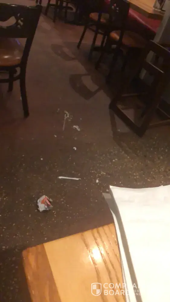 Myself and my family were out to eat tonight at your Machesney Park location. This picture attached is the view I had as I sat to enjoy my meal. It was more annoying to see the manager and several team members walk right through the trash and leave it there. GUEST PERCEPTION should always be in your mind. This was my first time at this location and probably won't be back.