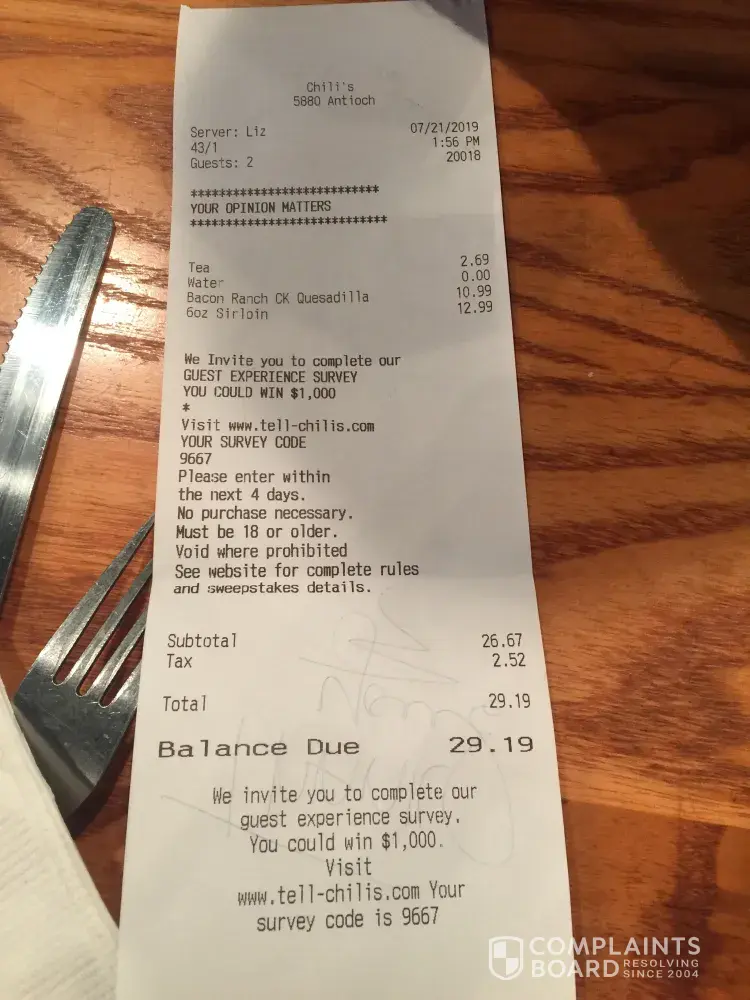 Everything was so bad because the lady who take the order she was so rude and trying to get us out of the restaurant by doing bad moments with her face while we are making the order so i asked for the supervisor she told me he is not her than i asked another person about the supervisor so he came and after telling him what happened he wasn't so worried about us and he said what do you want me to do for you so i told him to make for me a complain, than he just took my phone number and told they will call me but no one called me and it's more than a month now so do you really care for your customers because i was eating in once a week or twice a month but i really think no chillis any more for me.