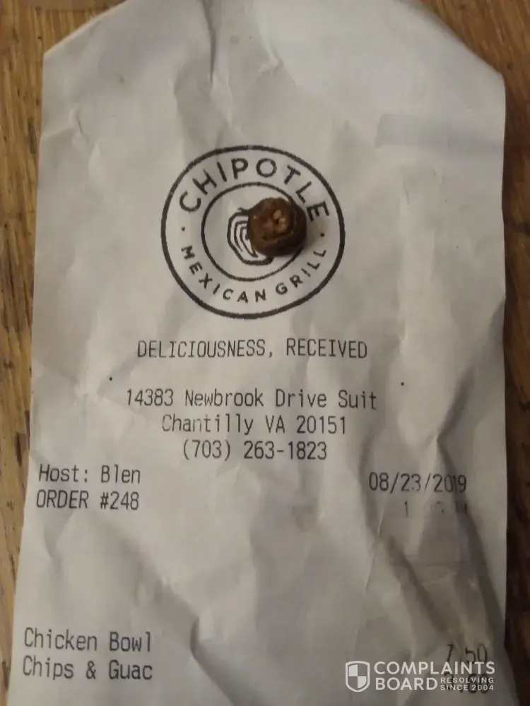 Hello, I was visiting my friend in Virginia and I decided to get something to eat from Chipotle. I visited your establishment on 8/23/19 @ 1:09 PM and ordered a Chicken bowl with chips and guacamole. When we returned to her house we started eating. I was eating as normal as always and dipped a chip into the guacamole and then I bit down on something that...