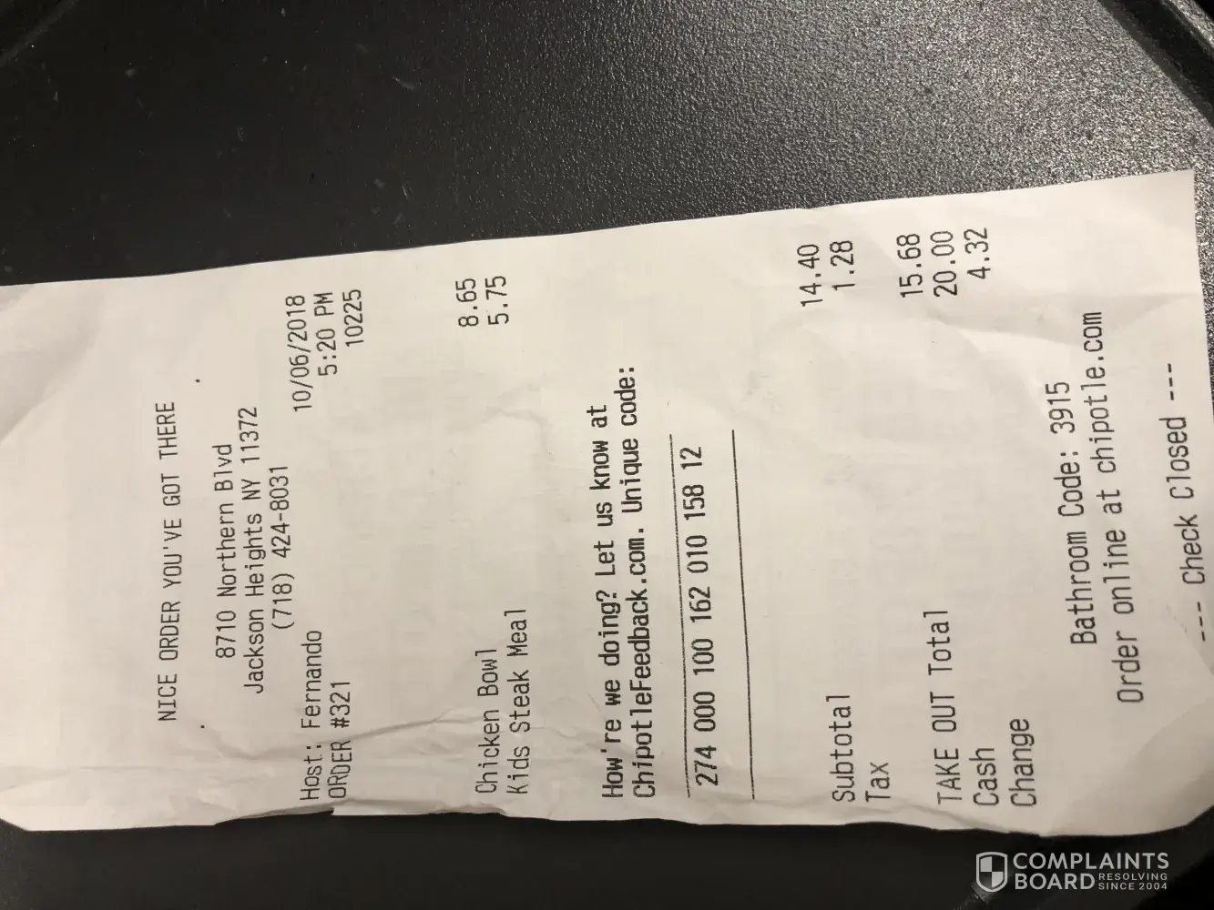 I went into chipotle on 10/14/2018 and purchased a burrito bowl. I always go
