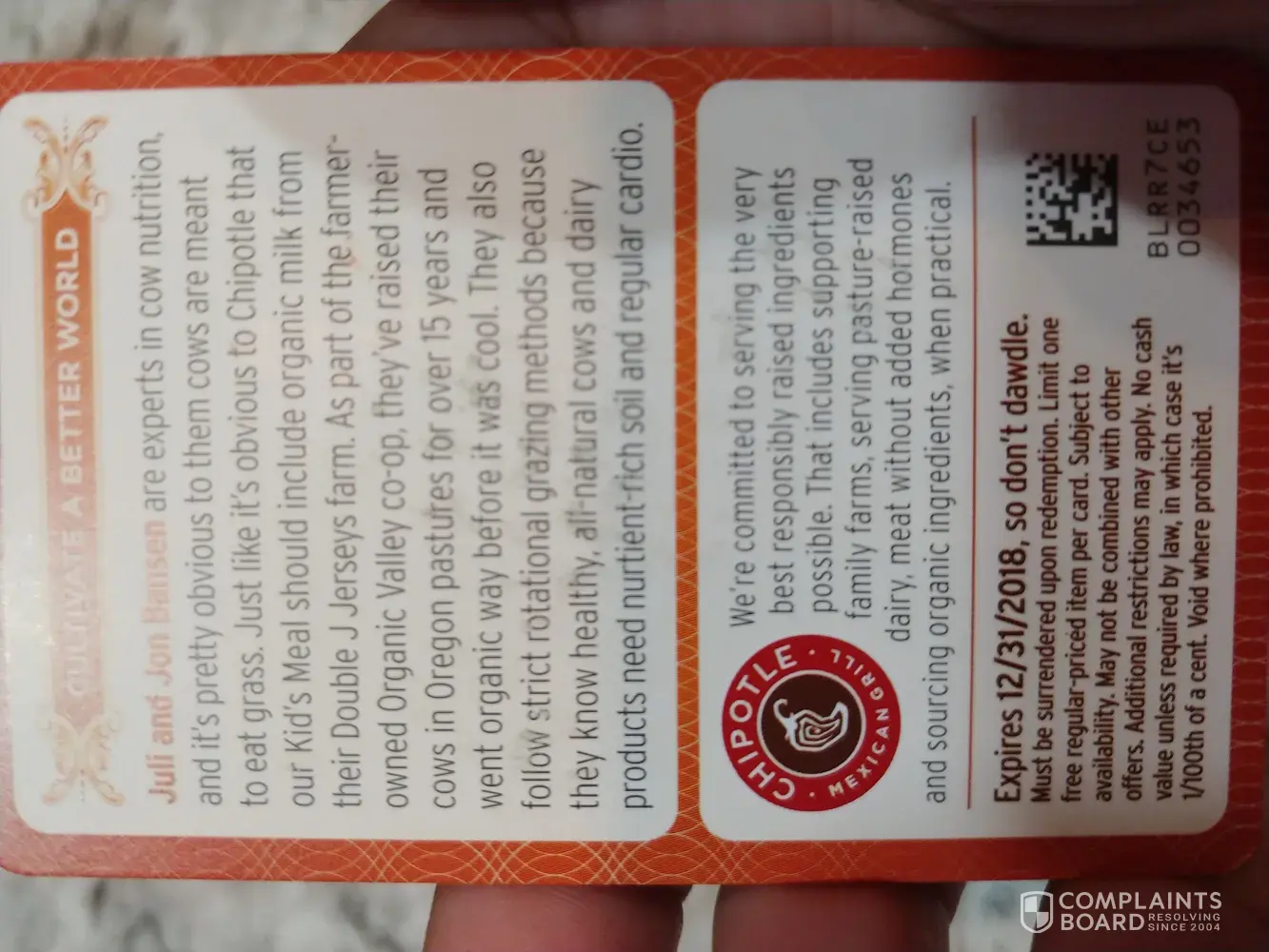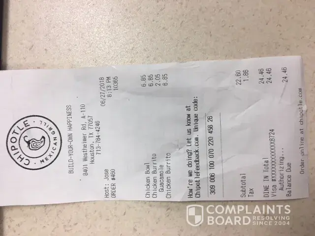 Today I bought a burrito from Chipotle PG Plaza and this burrito was the worst of the worst the meat was dry burn / scorch made the whole burrito taste like it was burnt very nasty then I only got a half a hand full of meat on a burrito you can count the pieces and all of them were burnt and scorched I could not eat this sandwich very disappointed I would like to be reimbursed $7.58 for a sandwich I had to throw away this place is fairly new and already it's gone to the dogs for me I want my money back
