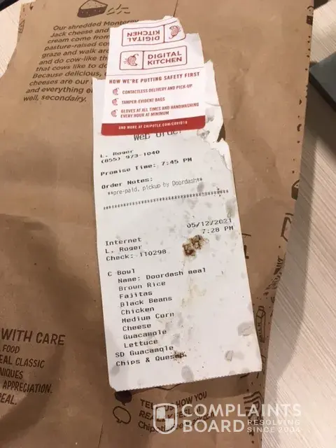 Read full complaintChipotle meal totally unsatisfactory: No Chicken, No plastic ware, No napkins, No Chips