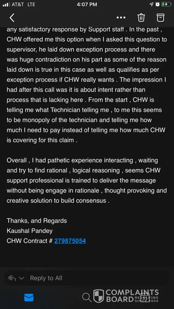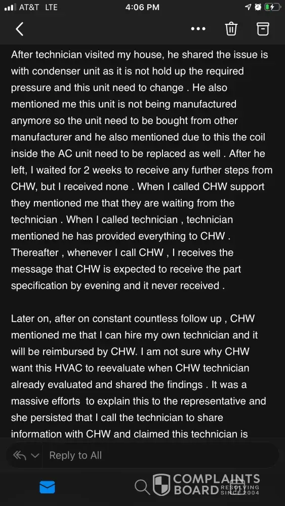 Then offered if I used their tech chw would cover labor, with tech who was out to get new system, can you say kickback.. I then chose to pay my own tech to come out and this company said only issue is blower motor is out, heat exchange not cracked, condensor fine. Now I can not even get a hold of anyone at chw.