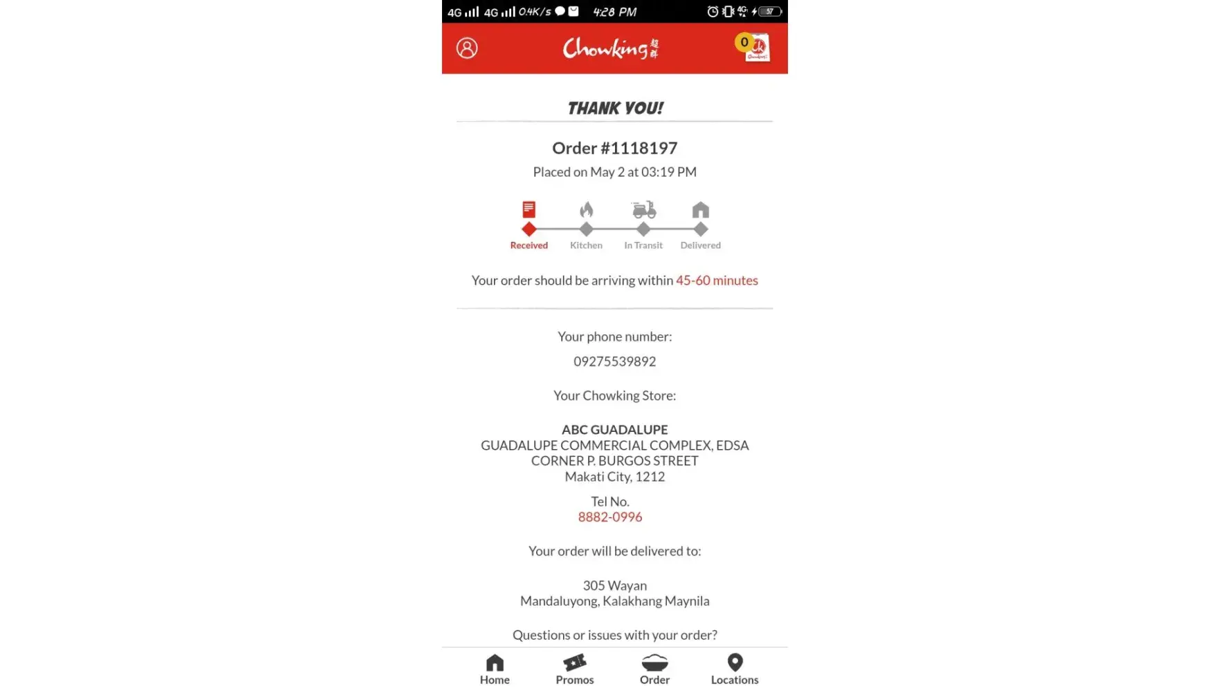 May 4 2022 nag order ako sa abc guadalupe chowking ng 3:19 pm hanggang ngayon wala pa yung order ko.