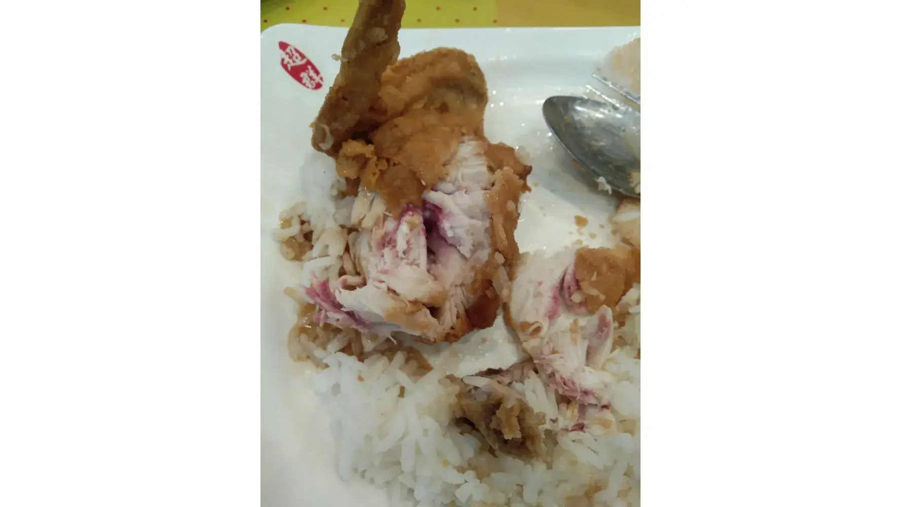 I want to complain about what i experienced lately this evening. I ordered a one piece friend chicken with rice and drinks as i was eating the said chicken i noticed there's some red color appeared inside the meat of the chicken i was disgusted that it wasn't cooked properly i told the cashier and showed to her i was embarrassed but held my composure as the cashier saw what I've shown she hurriedly replace it with a new cooked one but my appetite was lost already. Attached here is the photo of the chicken. I hope you'll get some attention to this matter. It happened around 730 to 8 pm today unfortunately i didn't get the receipt