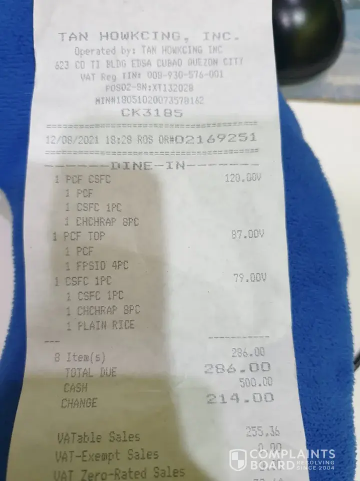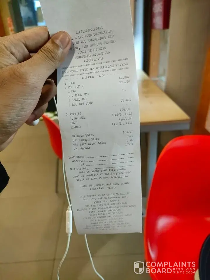 Good evening Chowking Gil Fernando Marikina, Bakit kulang yung binigay na order samin sa Drive thru? And yun receipt mamin ay wala pa samin kaya di kami makatawag sa store nyo Around 11pm tonight nagorder kami dyan sa drivethru -_- sobrang craving pa naman ako sa Chao pan with dumpling tapos wala pa yung Chicken lauriat hayst nakakainis nalang bumalik kasi from antipolo pa kami nagdrivethru nalang kami dyan dahil galing kami ng work.. Nakakadismaya kasi gutom kana tapos kulang pa pala yung order namin. Sana maideliver samin agad ito dahil tamad nadin yung asawa ko na bumalik sa store nyo at umuulan pa ngayon.