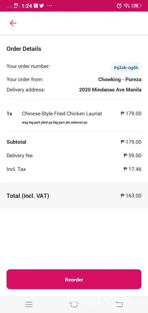 my order was thru food panda. i requested for no leg part. pero yung binigay ay leg part.sana manlang ininform ako kung walang ibang part talaga para saan pat nagrequest ako nakaka disappoint