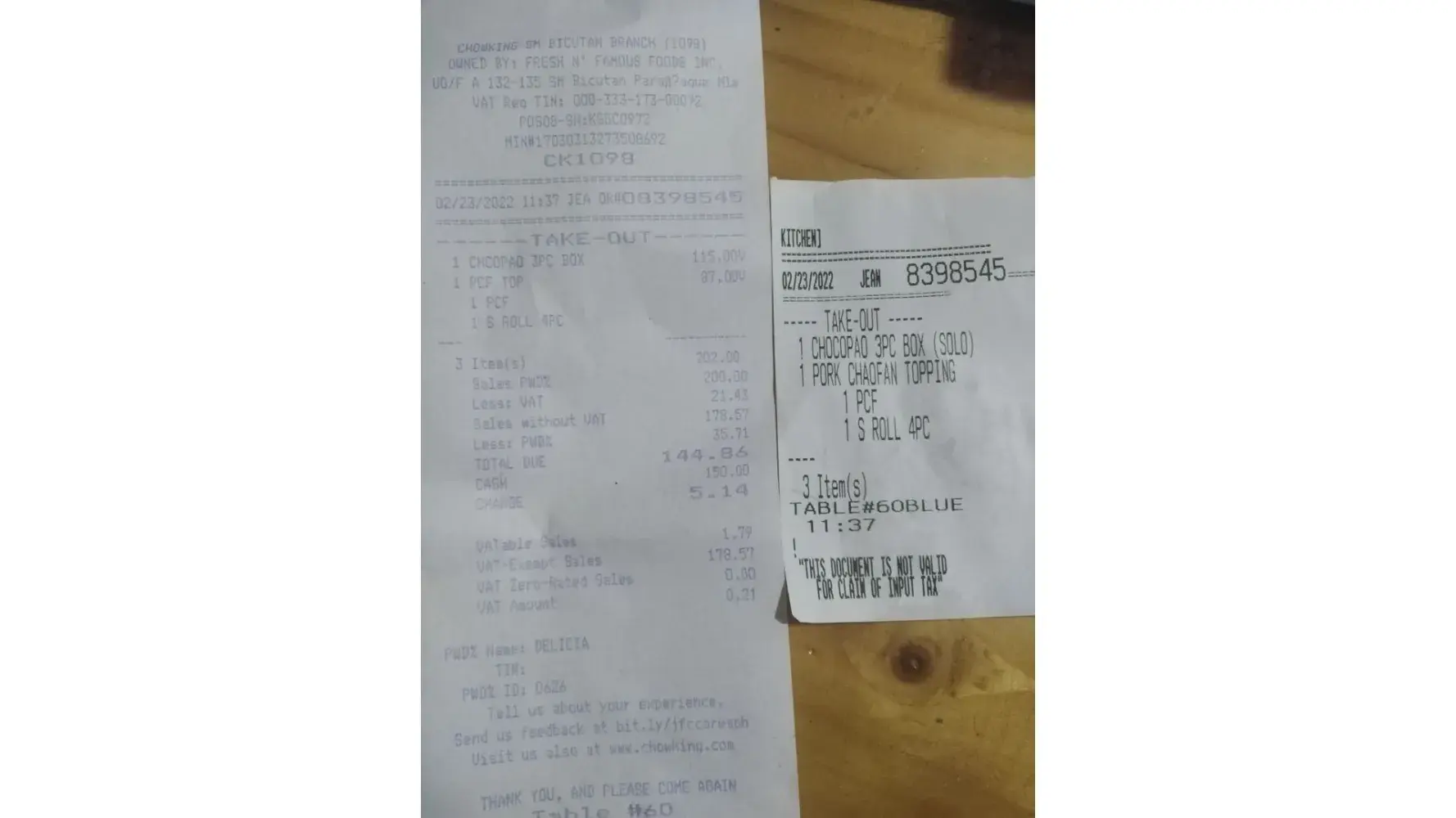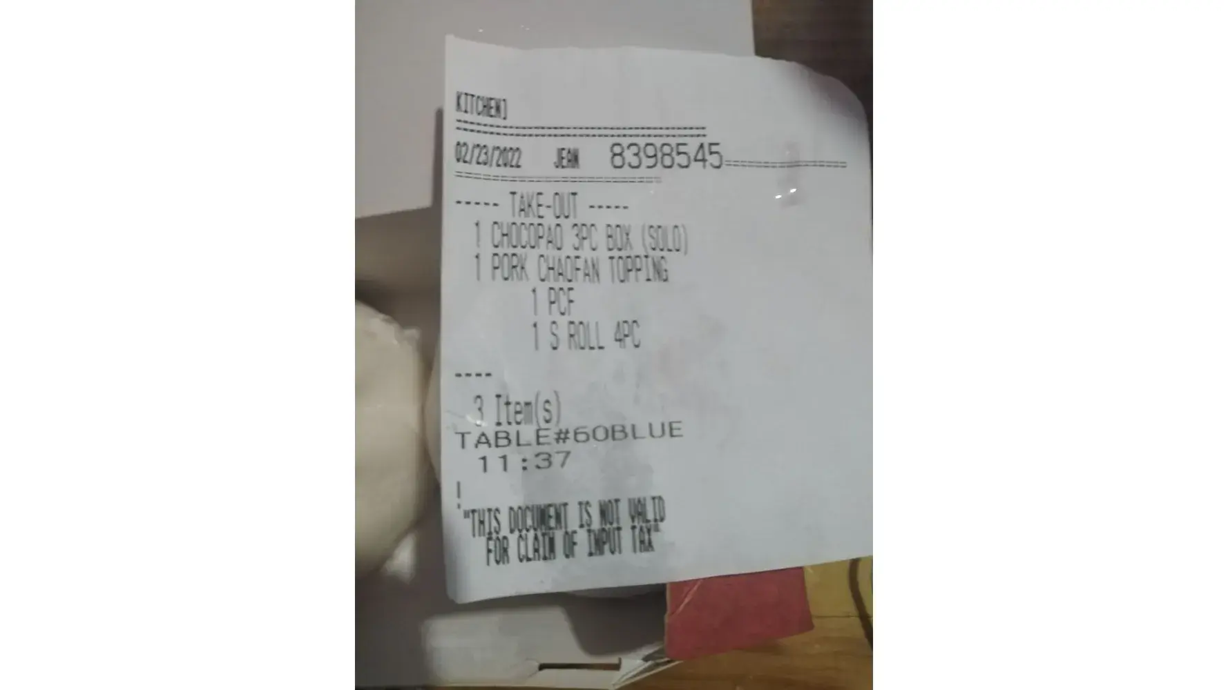 Today, february 23, 2022 at 11:37, I ordered (chaofan) and 1 box of chocopao, for takeout at chowking, sm bicutan, bldg a. When they call my number, I grab the product and left.
