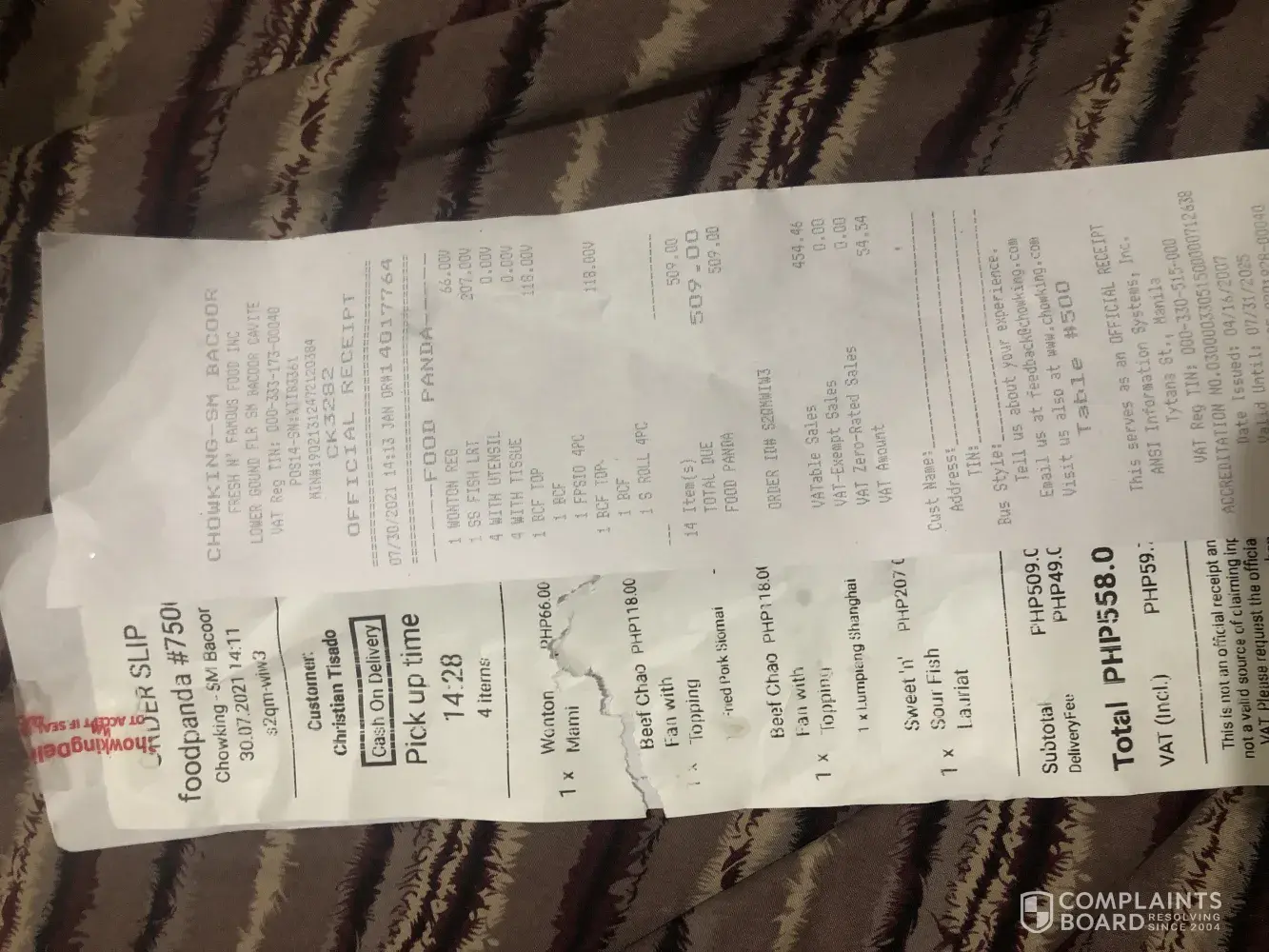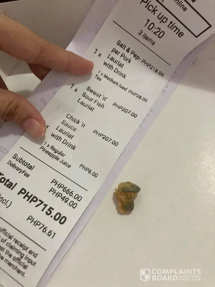 I ordered on food panda around 2pm under the name of Christian Tisado. Ang order ko po is wonton mami, bcf w/ fried pork siomai and lumpiang shanghai then sweet n sour fish lauriat. Tama nman po ung ibang nabigay na order pwera lang po dun sa lauriat. Ang dumating po ksi sa akin is yung sweet n sour with rice lang po. At first, di ko po pinansin bakit un ang dumating. Akala ko mali po ung napindot ko sa app so di ko pinansin at kinain ko lang po ung food and di ko na rn napicturan kse po gutom na rn ako. Then later on naisipan ko po icheck ung reciept ko kung mali nga ba tlga ako ng napindot sa app, but no. Lauriat po tlga ang naorder ko. I will attach the reciept for proof. I hope na di na po ito mangyare sa ibang customers. Please check dn po kung tama ang nailalabas na product sa fp. Thank you.