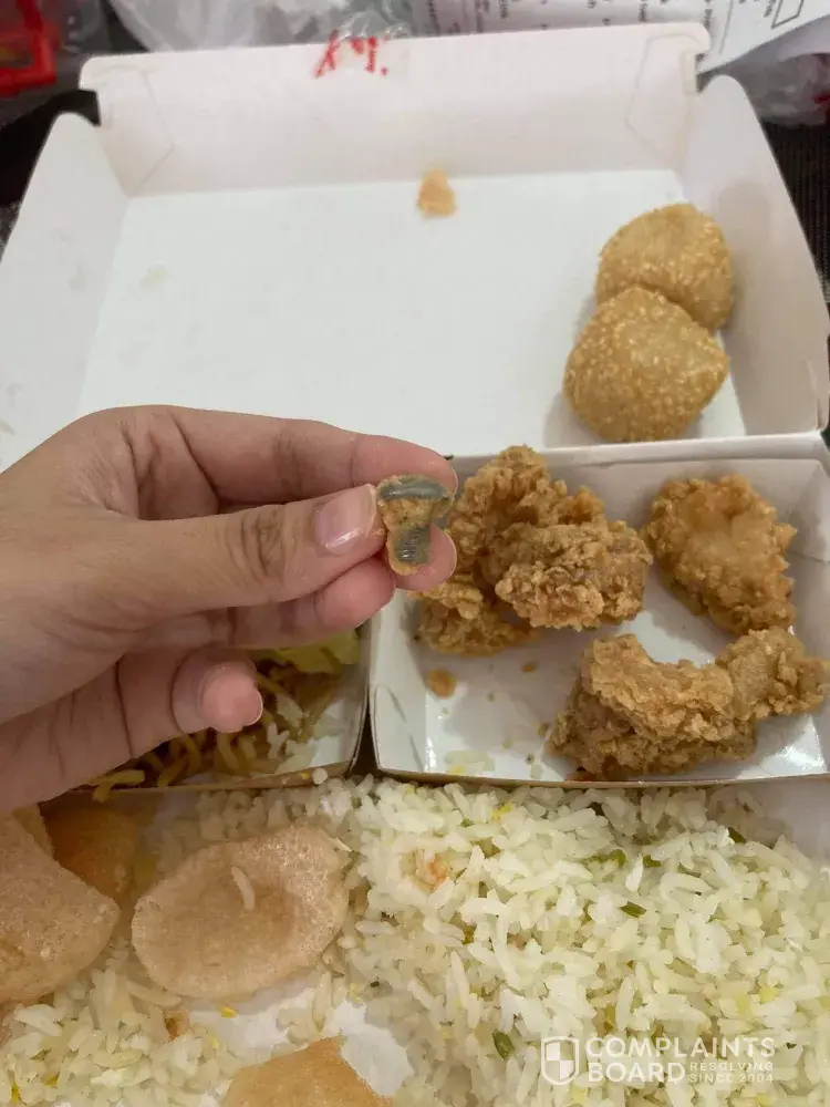 Meron pong screw yung manok ninyo! May halo siyang breeding kaya hindi gaano kahalata! Muntikan ko na po makain kanina! Bakit naman po ganun? Paano kung gutom na gutom ako at hindi namalayan? Paano po kung sa bata ito napunta? Edi baka nalunok na? Siyempre pagkain po itong services ninyo kaya isang kagat lang nasa stomach na namin ang luto ninyo and puwede ito makaapekto sa health! Hindi po ako papayag nang ganito! Ayokong maulit! Sana po mabigyan ng lesson ang mismong branch nito! Hindie ko pa po inaaupload sa fb itong picture, dahil ayoko pong masiraan ang company ninyo😠dahil mahal na mahal ko talaga ang chowking kaya nga mismong birthday ng ate ko ay ito ang pina-order ko. Pero malaking dissapointment po ang nangyari. Sana po mabigyan kaagad ng aksyon.