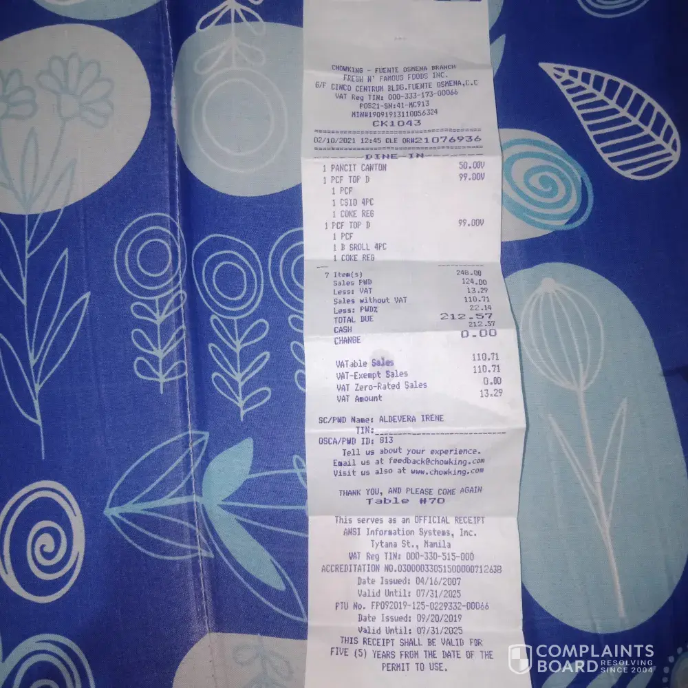 I order sweet and sour lauriat, 1pc chicken and small halo halo at 11:16pm and I got my order on 11:58pm. And I noticednthat my small halo halo is missing I tried to look for my receipt for follow up and i notice that the cashier failed to issued me an official receipt so i have to talk to the manager about it.