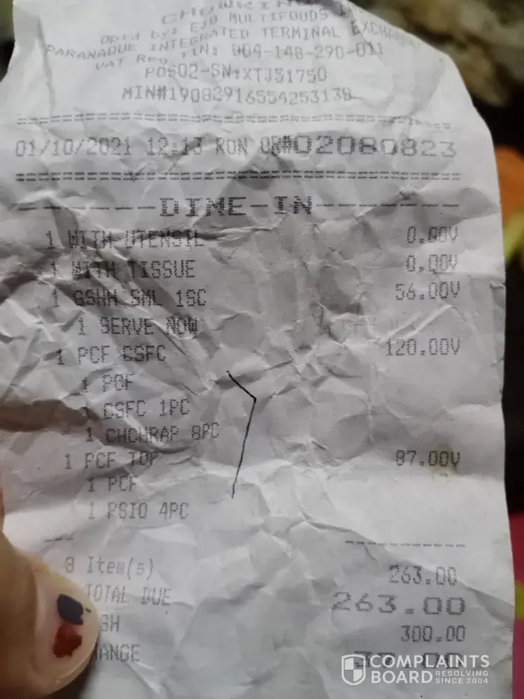 First time ko kumaen sa chowking pitx kanina, pero nalungkot ako ng iserved saken ay mali food instead na chaofan fried rice with 1pc chicken.. 1pc chicken with plain rice lng.. Tinanong ko kay crew kng bakit mali yung served n food dapt chaofan rice yun at hindi plain rice ang sagot nya saken plain rice lng dw yun.. Kita nman sa resibo na pcf (porkchaofan) un at hindi plain rice, hindi na ako nkipagtalo dahil gutom n rin ako sa biyahe.. Sana po maaksyunan nyo po yan na dapat po matraining lahat ng crew sa pagbabasa ng resibo at sa kitchen nmn po pakibasa po ng maayos ang resibo bago nyo iserved..