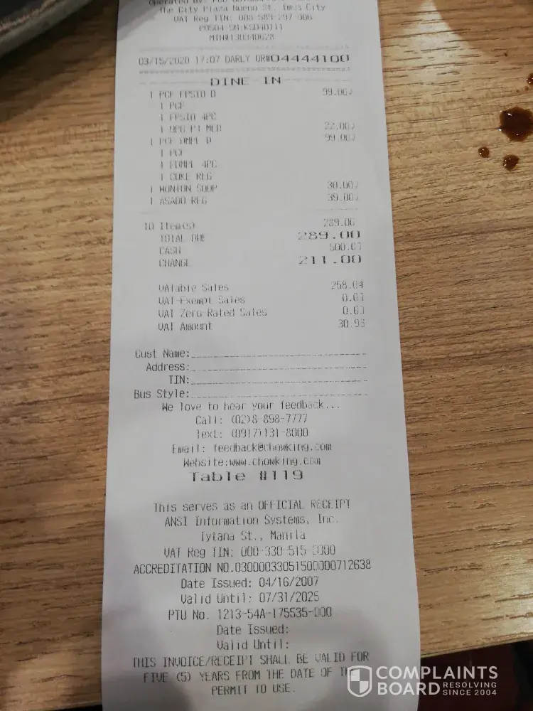 I called the grab driver and he was helpful to go back to chowking however the person i spoke in that branch keep on insisting for the receipt which I told a couple of time that was already thrown in the garbage.