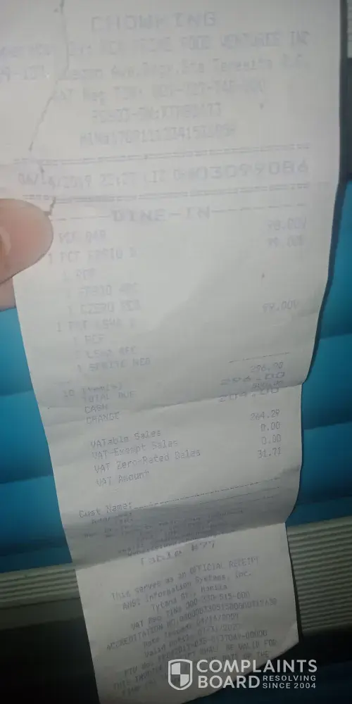 My other complains: no ice, no spoons, took so long to be cleaned. And also your branch their is very dirty, there were so many left over food on the floor, I think nobody bothered to clean it. I did not see the manager if there was any.