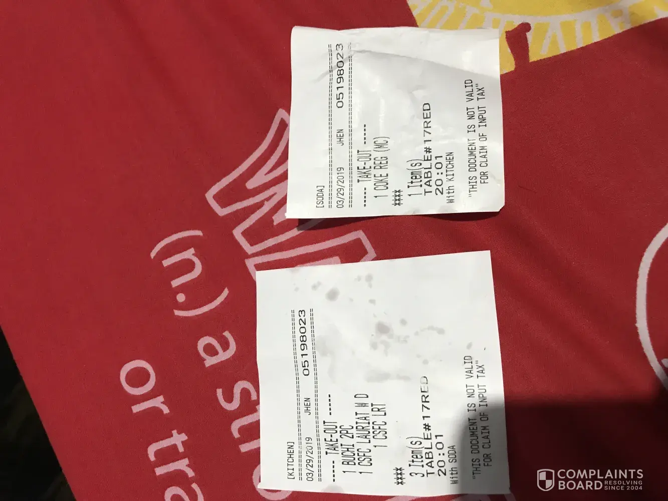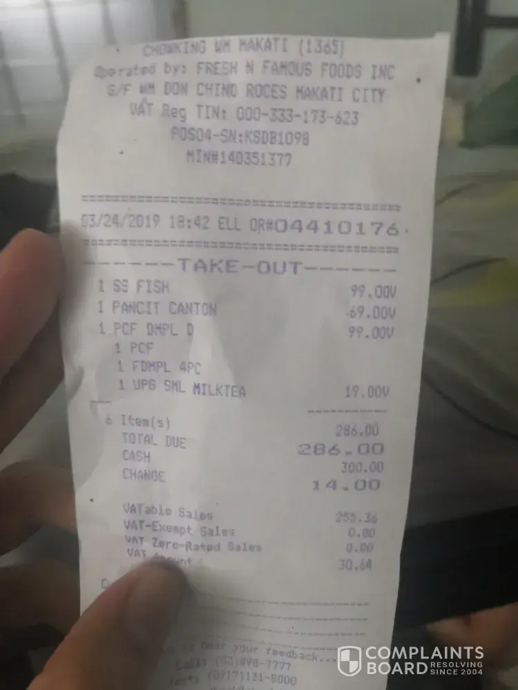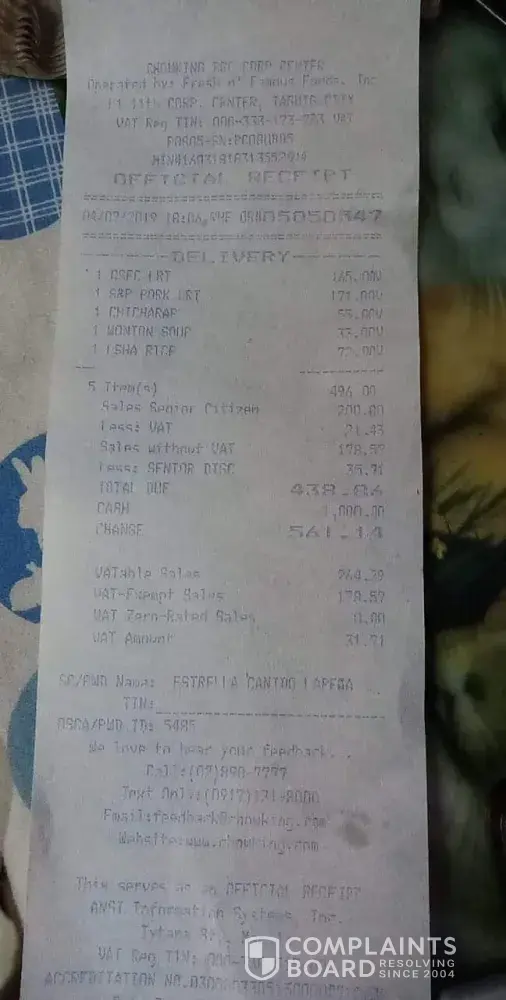 Attached here is the receipt and the photo of the food we ordered from Chowking.