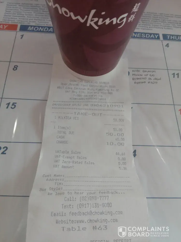 Last March 31, 2018 I ordered 1 Milktea Large for Take-Out and The Cashier Give Me 15 Minutes to Wait, Then After 15 Minutes yung Milktea di pa naaaout, then i decided to wait for another 5 Minutes, Then After that, nagdecide ulit ako na magwait ng 2 Minutes, After Nun nagpunta ulit ako sa cashier para ifollow-up yung order and tinanong ko pa kung ang minutes pa, wala namn binigay sakin kung ilang oras pa or minutes pa iaassemble and i decided na umupo ulit then wait for another minutes, then i decided to go dahil nagmamadali narin ako, then hindi ko na pnakuha yung milktea.