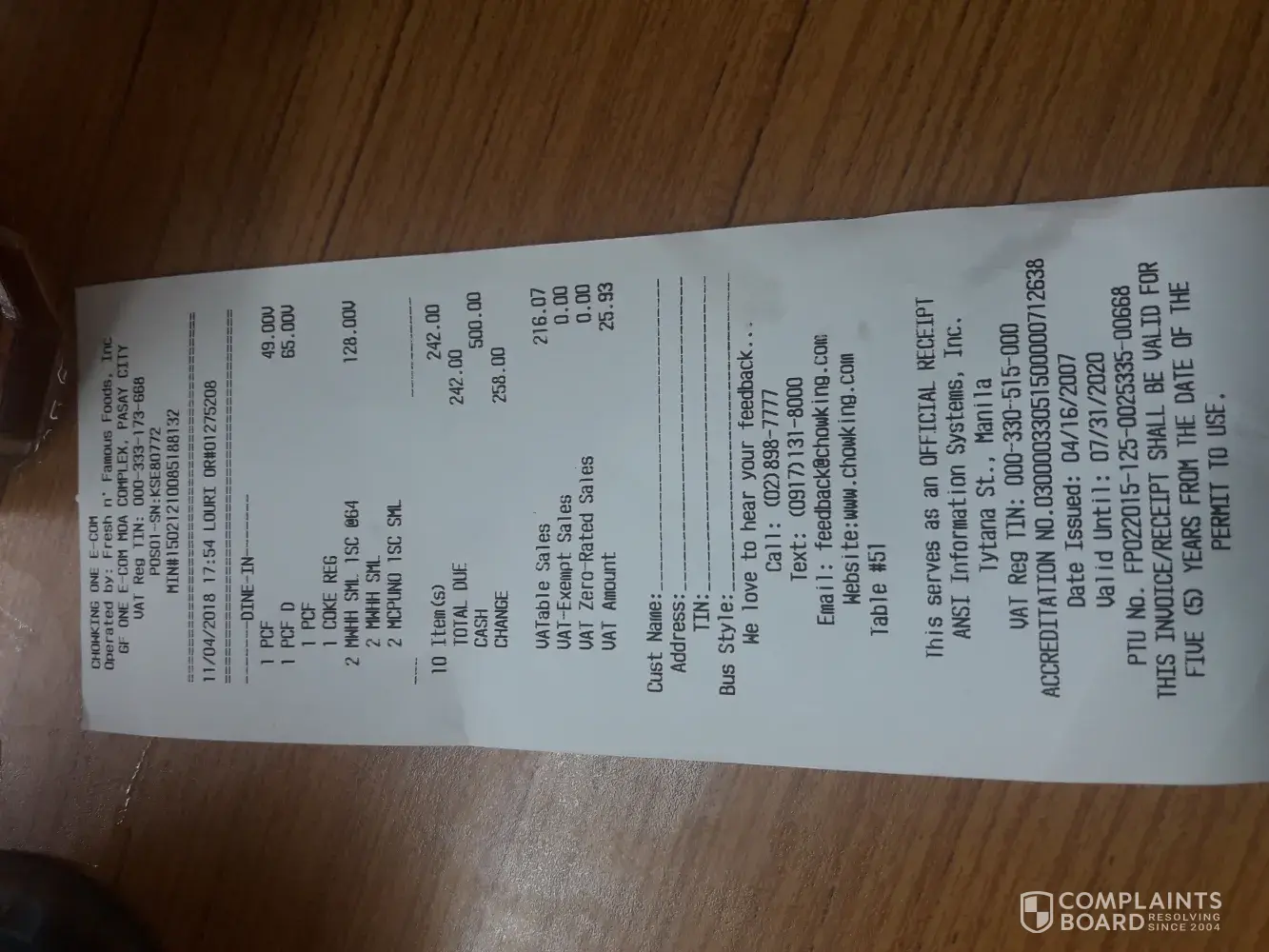 I wasn't able to take note of the manager's name but you could check his name on your records. If you would like to verify, I ordered three show fans, one porkchop, and a chicharap. Only the latter was delivered.