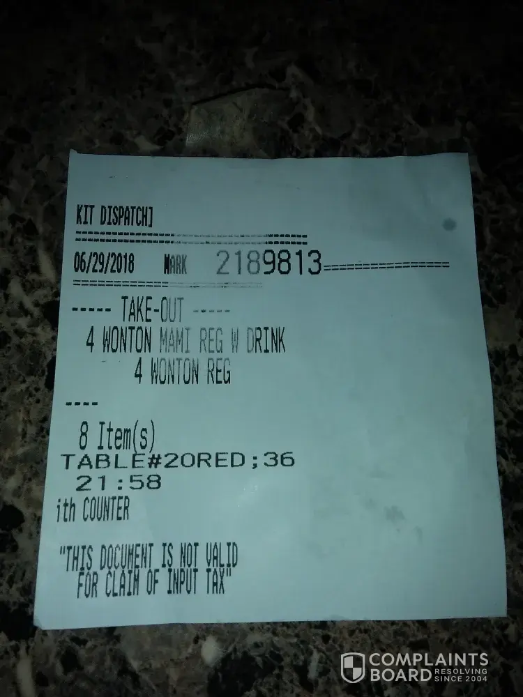 I ordered a 4 wonton mami but they only give me a coke and siopao and they didn't give me a receipt for my order And my money is 500 pesos and the cashier give me the change for my order but he didn't give any kind of receipt and my change is only 160 pesos and while im waiting i said to the one of their crew that where is the wanton that ive ordered but the staff says that i only ordered coke and siopao and i start telling to them that i ordered a wonton ive been waiting their for almost an hour