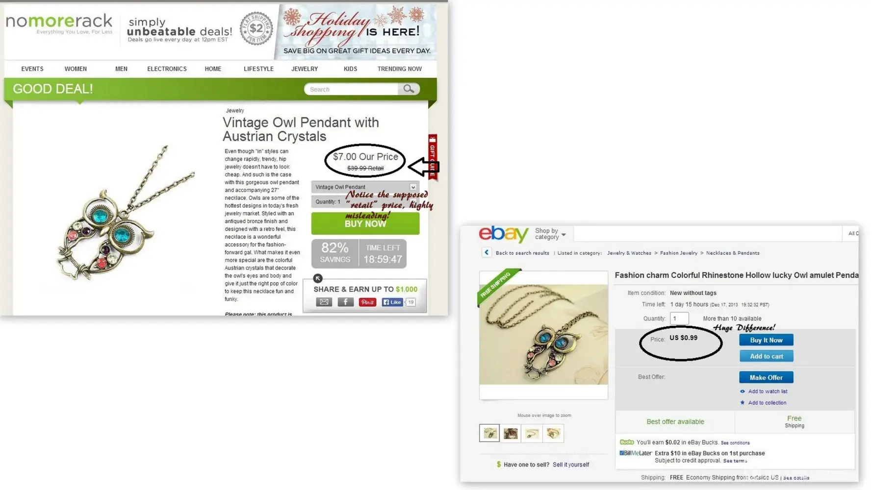 After doing some research on this company I have come to find that it is a huge scam and a huge waste of time and money. First off, their retail prices are GREATLY exaggerated. Most of the time you can the same prices on ebay or aliexpress, sometimes even cheaper Just one example being currently they have a little owl necklace online stating that the retail price is $39.99, and that have this supposed amazing price of $7, that is so laughable! The exact necklace is sold currently on ebay for $0.99. It is just a plain zinc alloy cheap necklace but they lie about the retail prices to make it appear as though you are saving an insane amount of money. Also I have noticed that the shipping time on their items is extremely slow which leads me to believe that they just dropship directly from China. And not to be harsh on China but they are widely known for their fakes and knockoffs as they do not have the stringent guidelines as they do here in the USA. Just about any silver toned piece of jewelry that you get from China will be stamped with .925 signifying sterling silver but 90% (probably more) of it is just plated bronze and nomorerack sells this garbage and tries to pawn it off as high priced, designer products