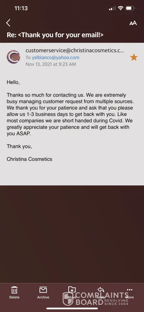 - Christina Cosmetics has been found to only resolve 34% of 0 negative reviews, indicating a lack of commitment to addressing customer concerns. Many customers have experienced long wait times for responses or resolutions, unhelpful or inaccurate answers to their questions, and a lack of follow-up or updates on the status of their issues.
