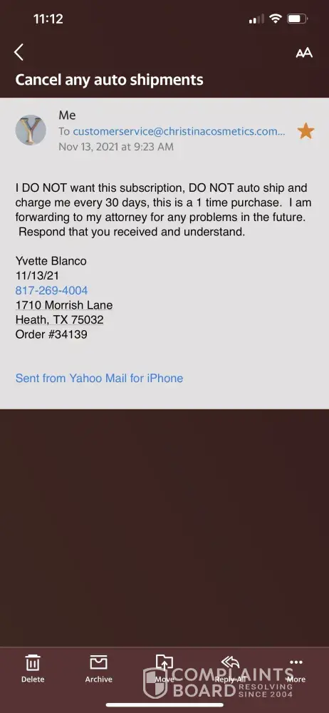 I rarely order anything from TV infomercials. However I decided to order what I thought was a one time only product from Christina cosmetics. Once I receive the package, part of it was products were broken and I didn't like the color so I just decided I won't re-order. Then on November 2, 2021 I was sent an automatic subscription that I did not sign up for or order or want. When I attempted to call the 800 numbers they provided they just ring with automated message however your terms and conditions say you must call and speak to someone to cancel. I want to cancel immediately. If this doesn't get handled promptly, I will be contacting my credit card and block these future charges. This company and is processes are a fraud. I never authorized any auto shipment of this product!