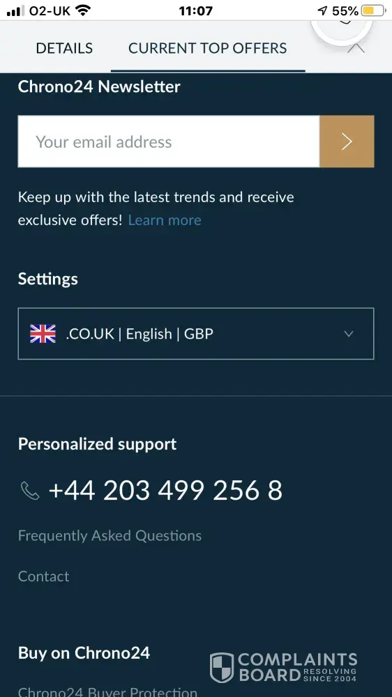 We found clear and detailed contact information for Chrono24. The company provides a physical address, 2 phone numbers, and 2 emails, as well as 5 social media accounts. This demonstrates a commitment to customer service and transparency, which is a positive sign for building trust with customers.