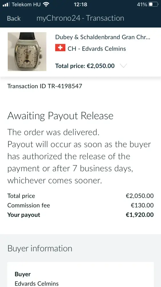 Hi, I sold watch on Chrono24 for 2000€ and buyer has it but Chrono24 don't give information about my payout since 10days .