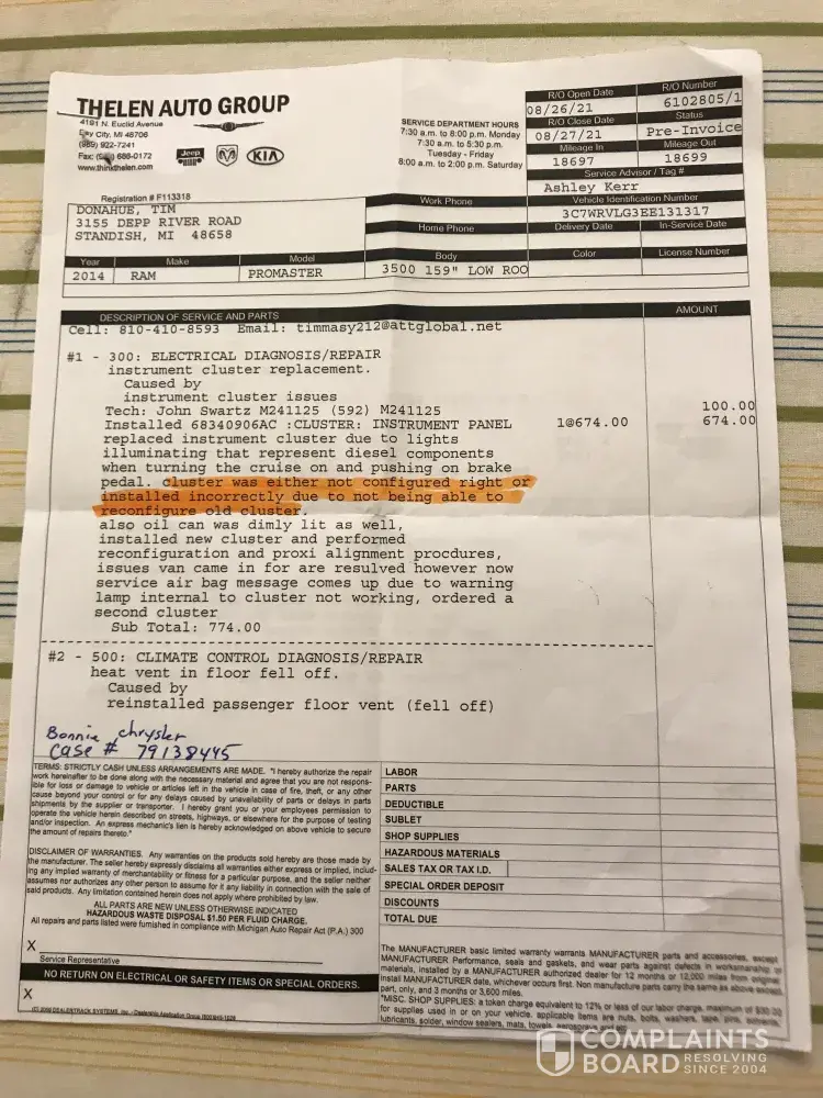 I purchased a motorhome that's on a 2014 Ram promaster frame on January 27 2021 from an individual. It had 7800 miles on it at time of purchase. I test drove the vehicle with no issues showing at that time. Within 200 miles when I would use the cruise control the the cluster panel showed two icons that showed for a diesel engine when I have a gas engine. When I took it to the dealership they said (" cluster was either not configured right or installed incorrectly due to not being able to reconfigure old cluster "). Since this came from the factory this way I don't think I should have be paying for the repairs. I have been in contact with customer service and it was indicated that they would help( case# [protected]). Now that the part has been replaced customer service says they will not help. The part, installation and diagnostic cost me $ 824 plus tax.