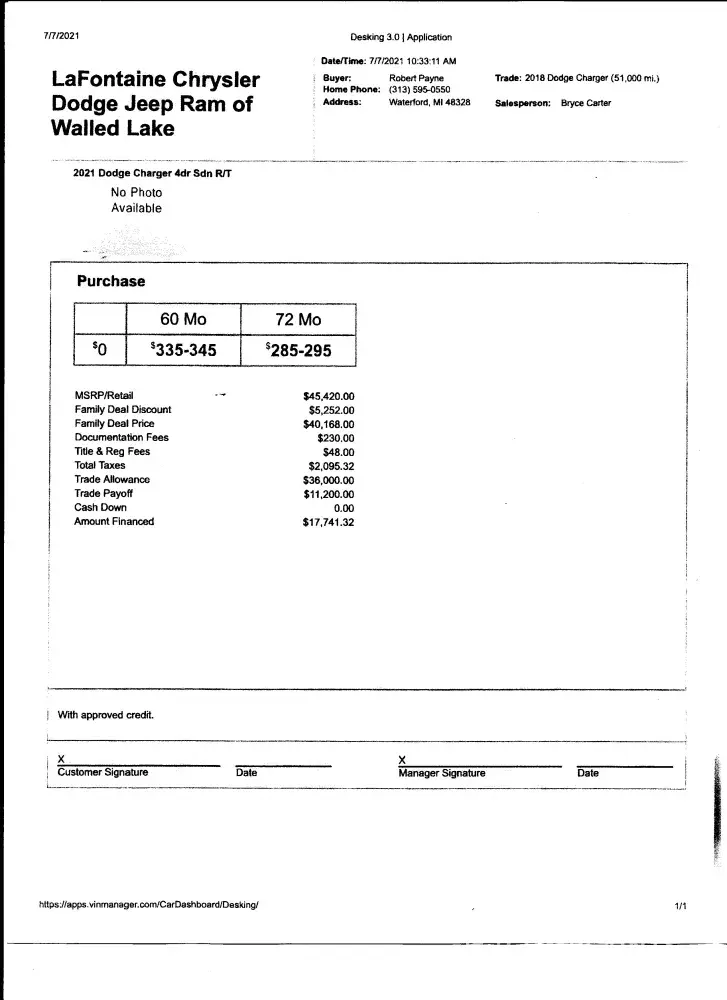 I returned to LaFontaine Dodge to try and figure out some way to salvage the deal made on 7/7, I believe the sales number they gave they knew was not good but it would keep me ordering from another dealership, and it worked.