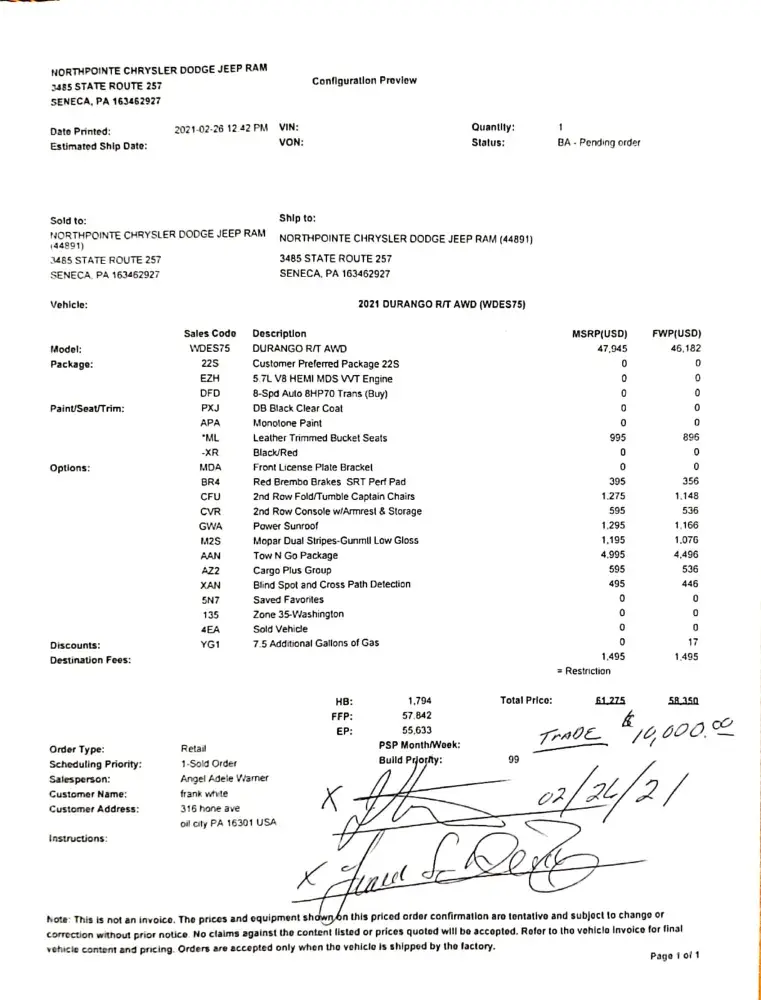 Desired outcome: Order a new Durango RT as ordered before, expedite delivery with same deal as orginally given.