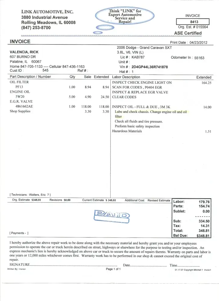 3) On 7/31/2018 at 97, 700 miles. He placed it with NAPA EGR part # 2-2482 $332