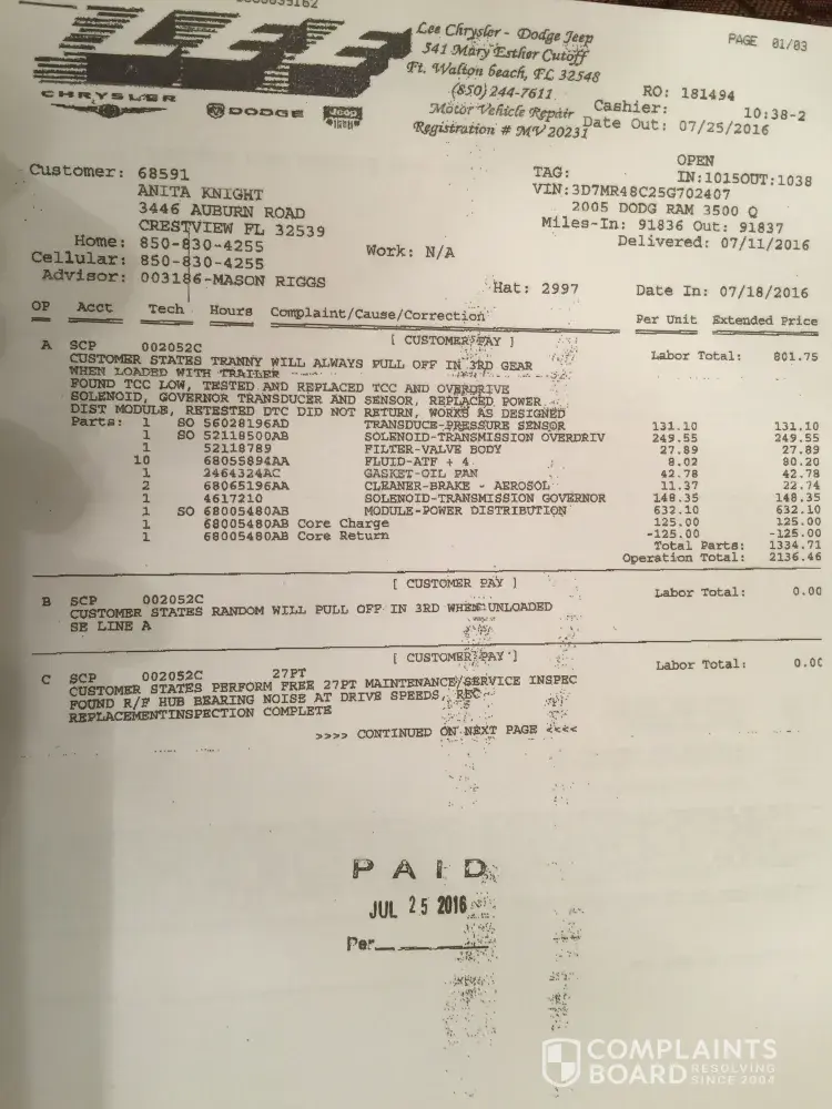 Really pissed. At the end of July I took my Dodge 350 to FOrt Walton Beach, Fl Lee Dodge dealership because transmission was stuck in 3rd gear. They installed new sensors, solenoids and a new power control module (computer). Cost $2300. Two weeks ago and less than 1000 miles the truck became stuck in 3rd gear again. I took it back and same dealership service Dept said I needed a new transmission because oil pan had metal in it indicating torque converter had come apart. Estimated cost $6000+. They accepted no responsibility for previous work for exact same issue. I declined their offer (have to admit I am not proud of my choice of words). 😡😡😡