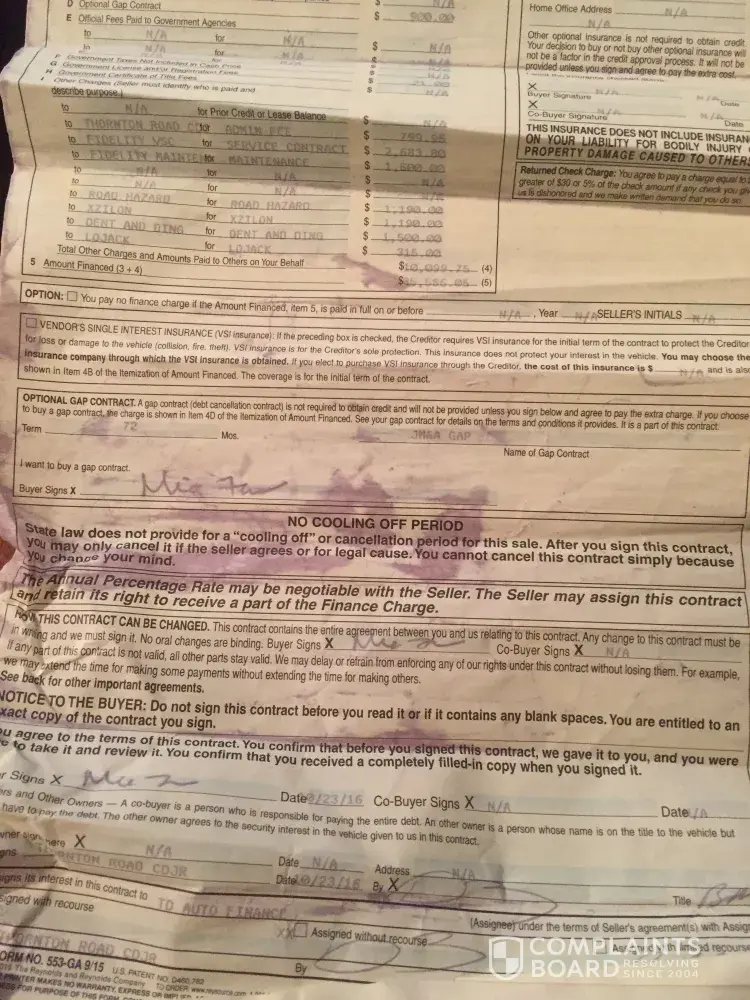 When the sales department decided to help they offered get me into a new car a Dodge Caravan for more money and to give me $15, 000 for a car that I just paid $30K for not even 6 months prior do they think I am stupid. I want Chrysler to force them to buy this piece of garbage back and I will be on my way. I am so done. I got railroaded it seems I told them when I got the car how much I could pay 400 a month maximum, they set everything up, they said take the car home with you, I did this was a Saturday, Monday I don't here anything, Tuesday it appears that there is a problem with the financing, I go back, I am told I can't have the extended warranty, the undercoating and sealant package, the tire warranty or the insurance included in my financing and that my interest will be higher which makes no sense I got the same interest as someone buying a use car, my brother has excellent credit and it was being financed under his name. Not only that the payments are 100 more then what I stated but I was caught between the rock and a hard place. I have never been so disillusioned by a company in my whole life. I will never buy a Dodge again nor will I ever deal with MRC once this is resolved, they are crooks, the cost for just an oil change is ludicrous