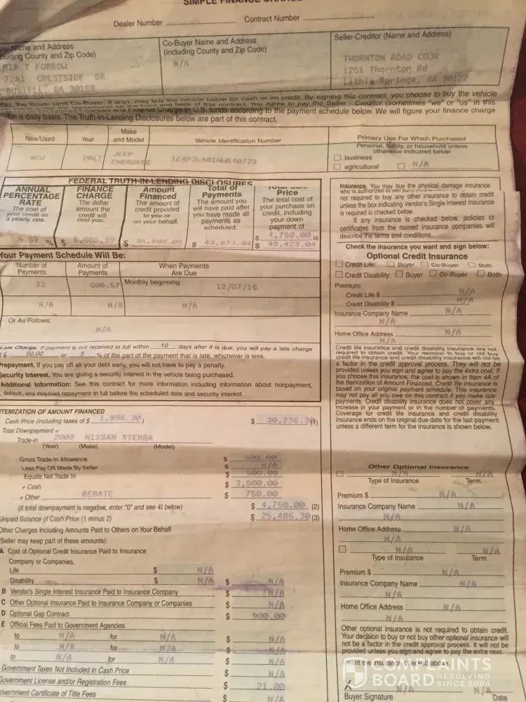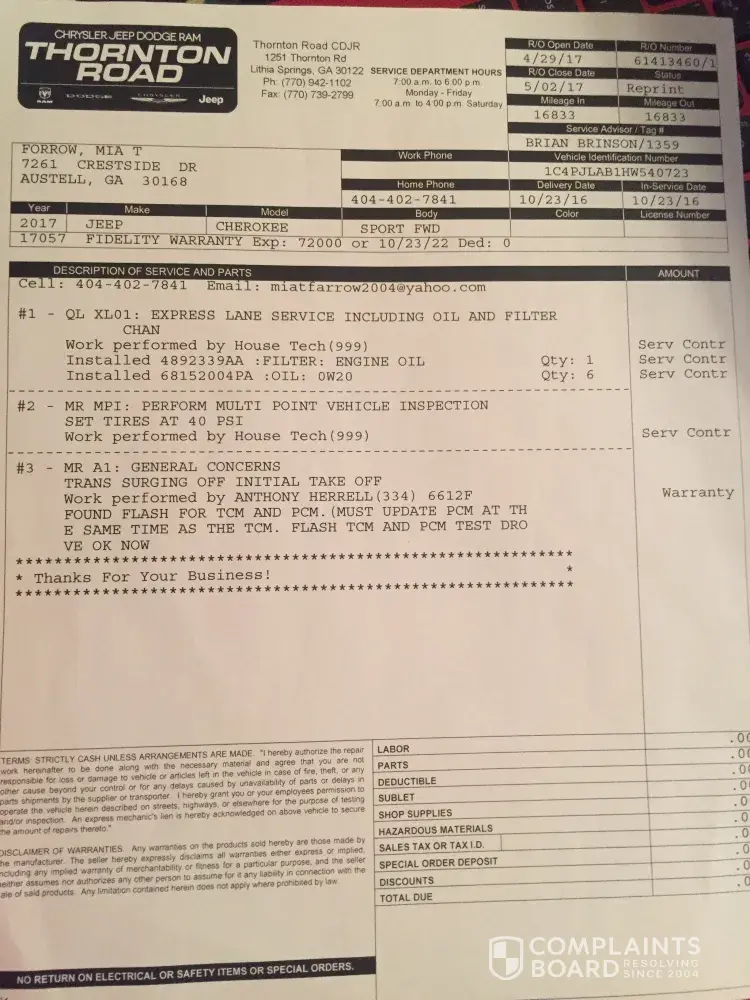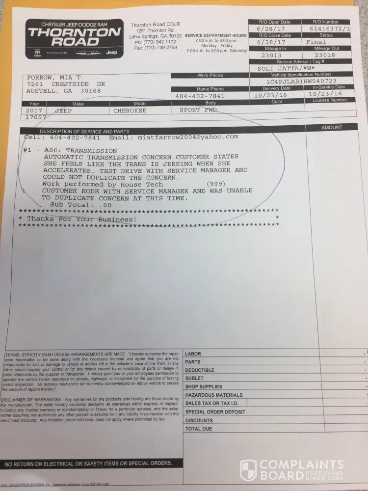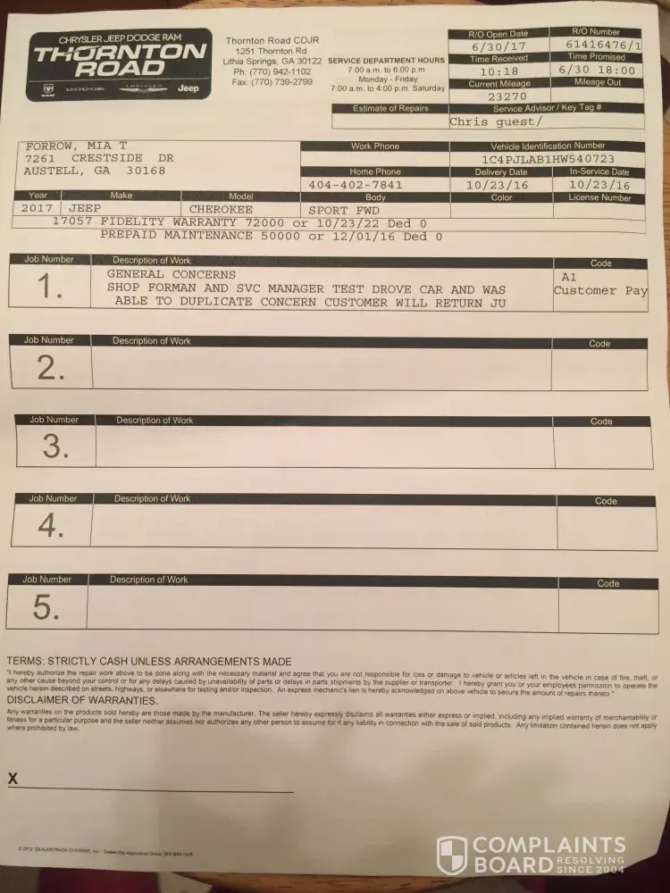 Below is the letter that I sent to the Thornton Road dealership, in regards to my Jeep, Cherokee that I purchased new in October 2016. I am asking that you respond no later than 10 days from the date listed above. I will take further action if my issue is not resolved. Please read the letter below, that I sent to the dealership that has made attempts to repair my vehicle.