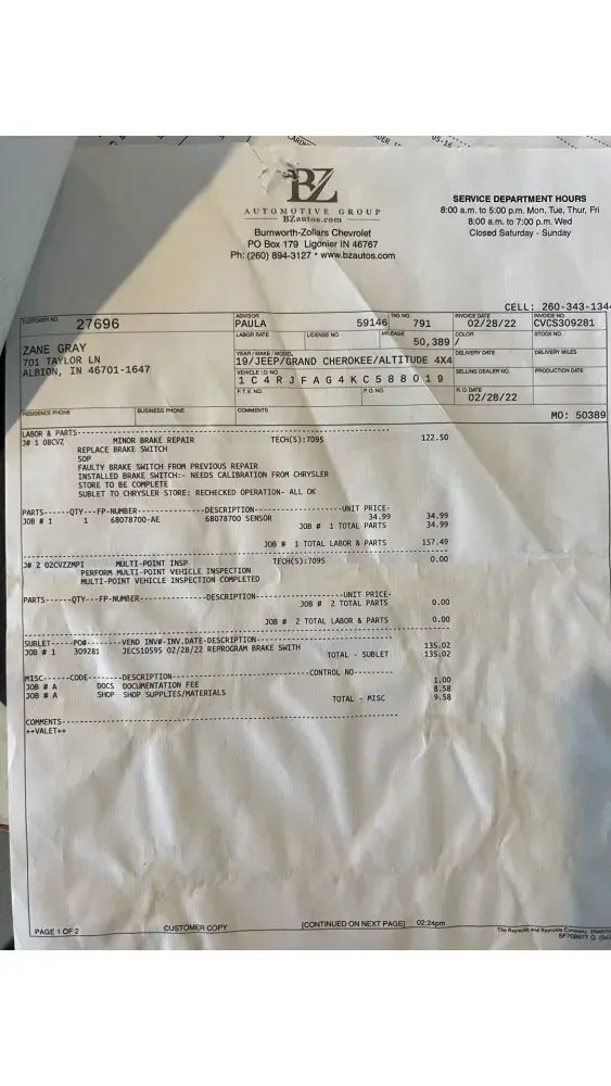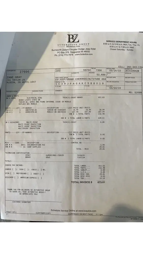 I'm not one to usually complain. I don't write bad reviews, but I think Chrysler should be aware of this. I'm in the Air National Guard, I work hard for my money (as I know all honest people do), I sacrifice a lot of time away from my family and for our country and when I pay for something that I feel I shouldn't have, I get a little frustrated. My husband and I will never by a Chrysler product again because of this journey. My 2019 Jeep Grand Cherokee was in the shop three times for the same issue: my brake lights would stay on and you could start my jeep without pushing on the brake pedal. Being a mother of two young boys, this is a huge safety issue for me. On 28 February 2022, the dealership replaced the brake switch and reprogrammed the brake switch - $304.54. That didn't fix the issue, same thing would happen, my brake lights would stay on and you could start the jeep without pushing on the brake pedal. 16 May 2022, the dealership traced all wires and found internal issue in module (They had my vehicle for a week!) Replaced ABS module - $673.61. Issue was still not fixed. 23 May 22, dealership removed and replaced ABS module and programed module (warranty). ABS causing brake light to stay on, dealership started a star case and star recommended the HCU be replaced due to an integral brake system pressure sensor that may be reading incorrectly. They did this and it fixed the issue. They had my Jeep for another week and didn't charge us for the fix because they felt so bad. Later Z48/NHTSA 22V-426 recall was issued (I think my case is one of the reasons it was issued)! Guess what the recall is for - an HCU/ABS module that falsely reads pressure which causes the brake lights to illuminate as well as allows the vehicle to start and shift out of park without the brake pedal being depressed. We paid $978.15 for something that was covered under the Z48 recall and when I submitted a case on www.fcarecallreimbursement.com it was denied. Very unhappy customer. Thank you for listening to my story.