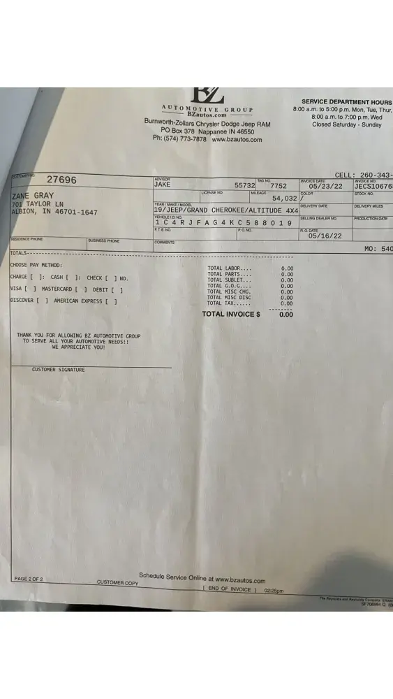 Service work done at mc kinney dodge chrysler jeep mazda, in easley, s.C. C.