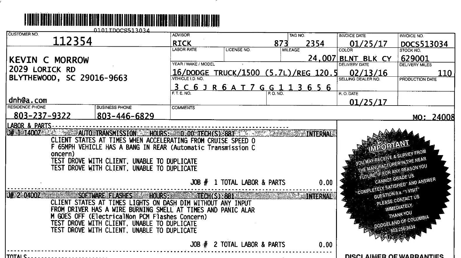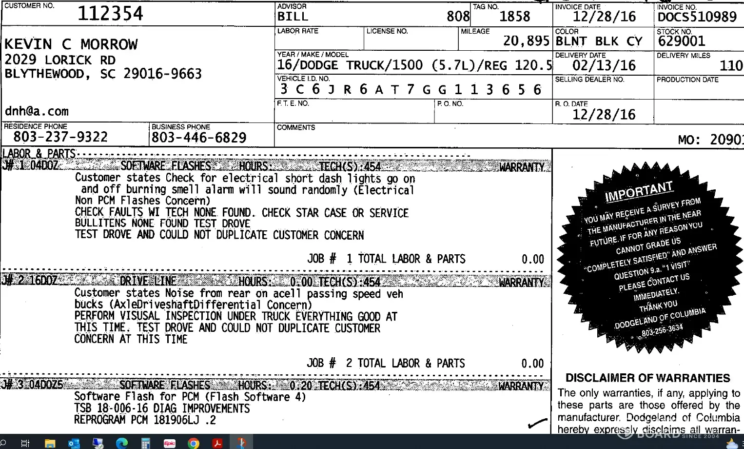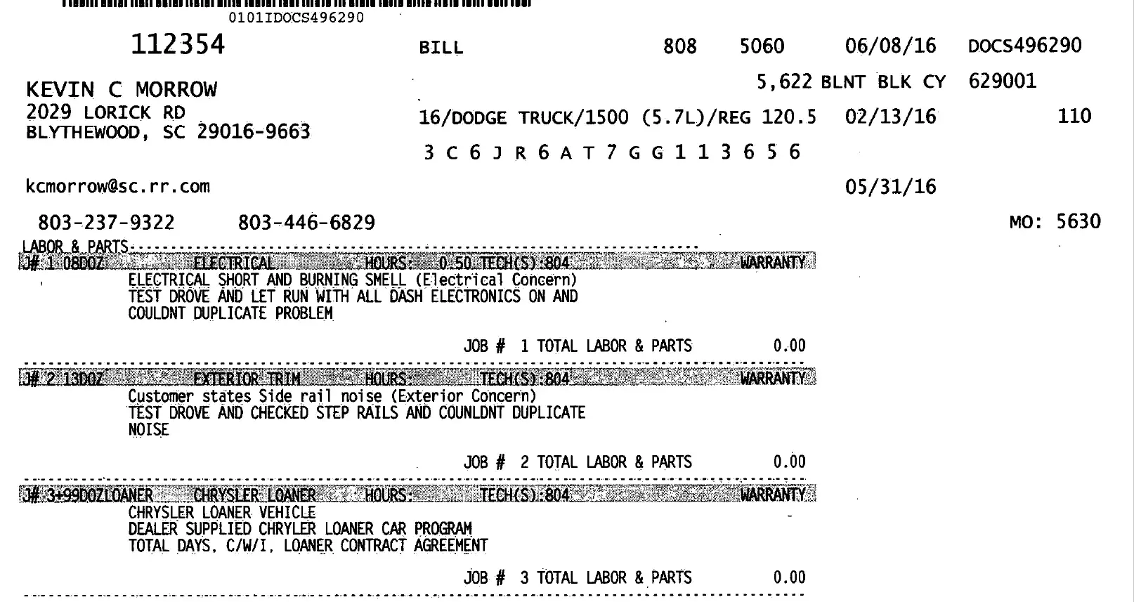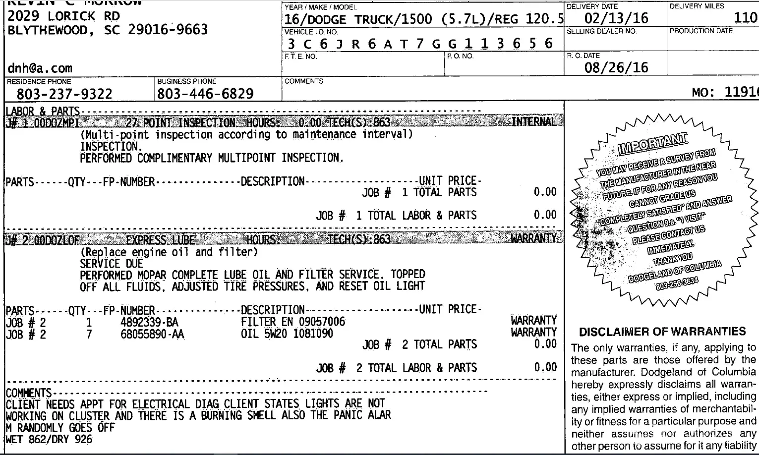 I purchased a brand new 2016 Dodge Ram 1500 truck and have had electrical issues from the 3rd day I bought it till now. I paid $31,000 for a truck and three days later I was at Dodge Land of Columbia SC explaining the strong burning wires smell. They wanted to keep the truck for a few days to go over it, I said of course. Well I was upset as they didn’t even want to give me a loaner car, how professional is that. They kept the truck a few days and told me they couldn’t find anything. I took it back multiple times and made multiple phone calls to them and yet nothing ever got resolved. Attached are some of the work orders I got from Dodge Land in SC. I know there is an electrical problem, here are some of the things that have been happening.