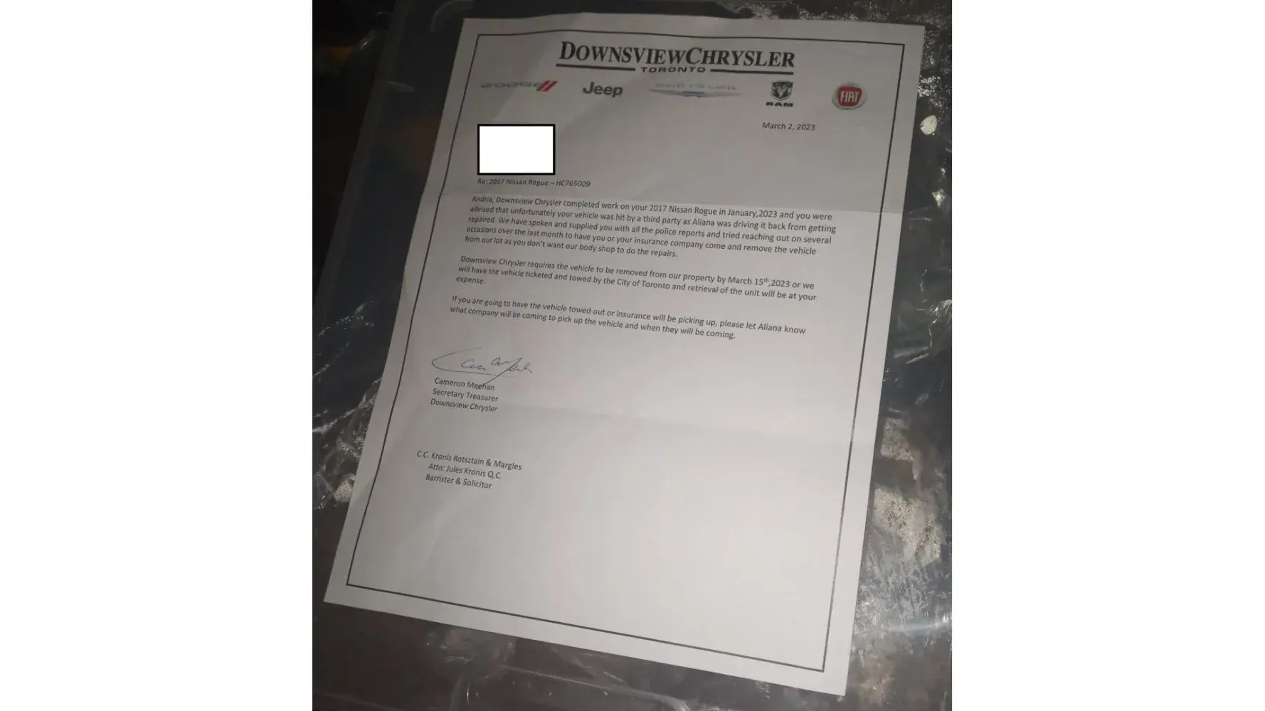 I also received a letter from Downsview Chrysler cc'd to their Barrister advising that my vehicle should be removed from their property or it would be ticketed and towed by the City of Toronto and retrieval will be at my expense even though I were not aware of all the events that happened before the accident was brought to my attention.