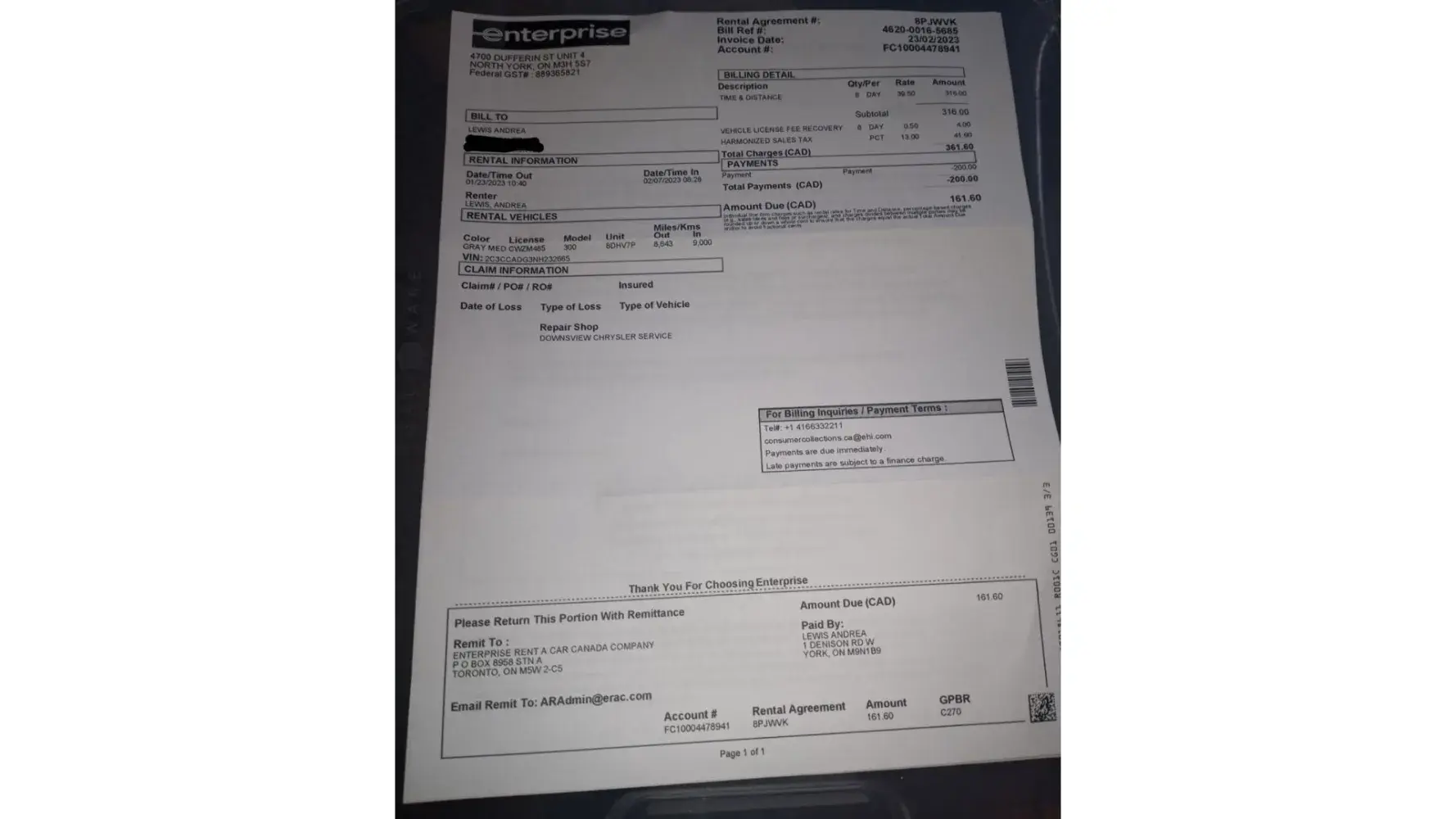 My name is Andria Lewis and on Monday January 23, 2023, I brought my vehicle, a Nissan Rogue, in for a scheduled appointment at Downsview Chrysler to be serviced because the tailgate would not open. At which time I was provided the use of a rental until my vehicle had been returned to me.