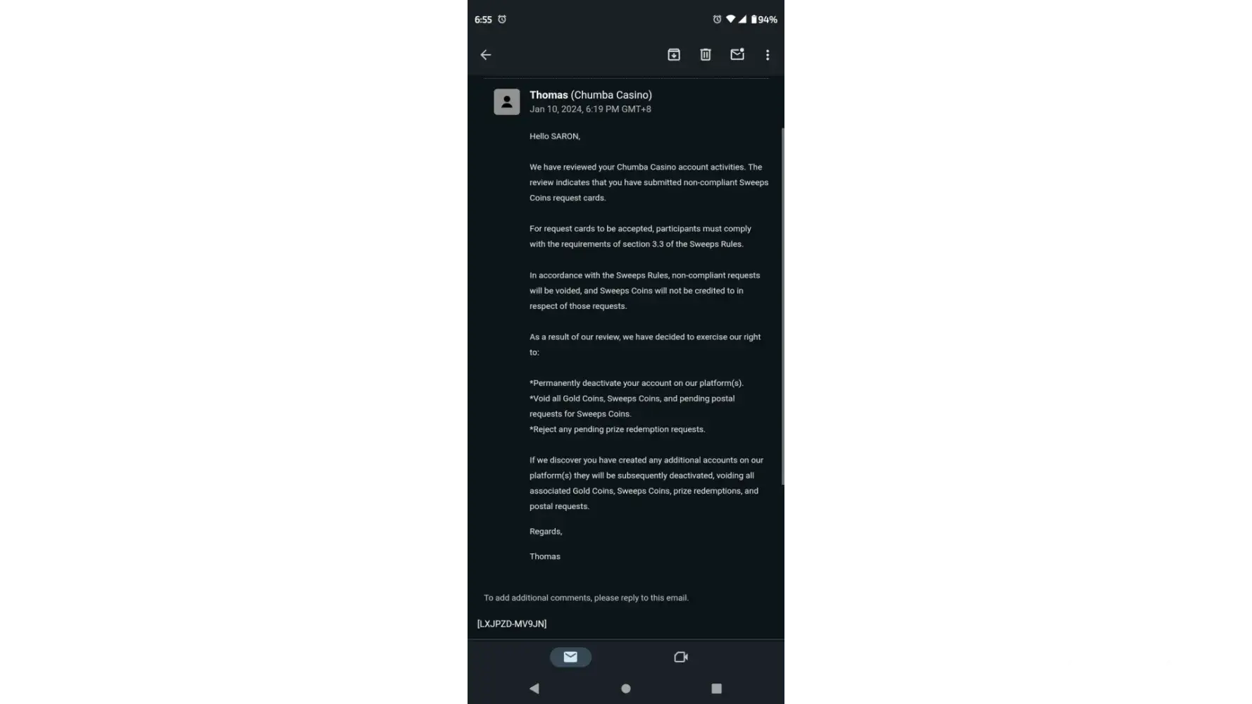 Complaint from [protected]@gmail.com reported on 22 October 2023 about Chumba Casino