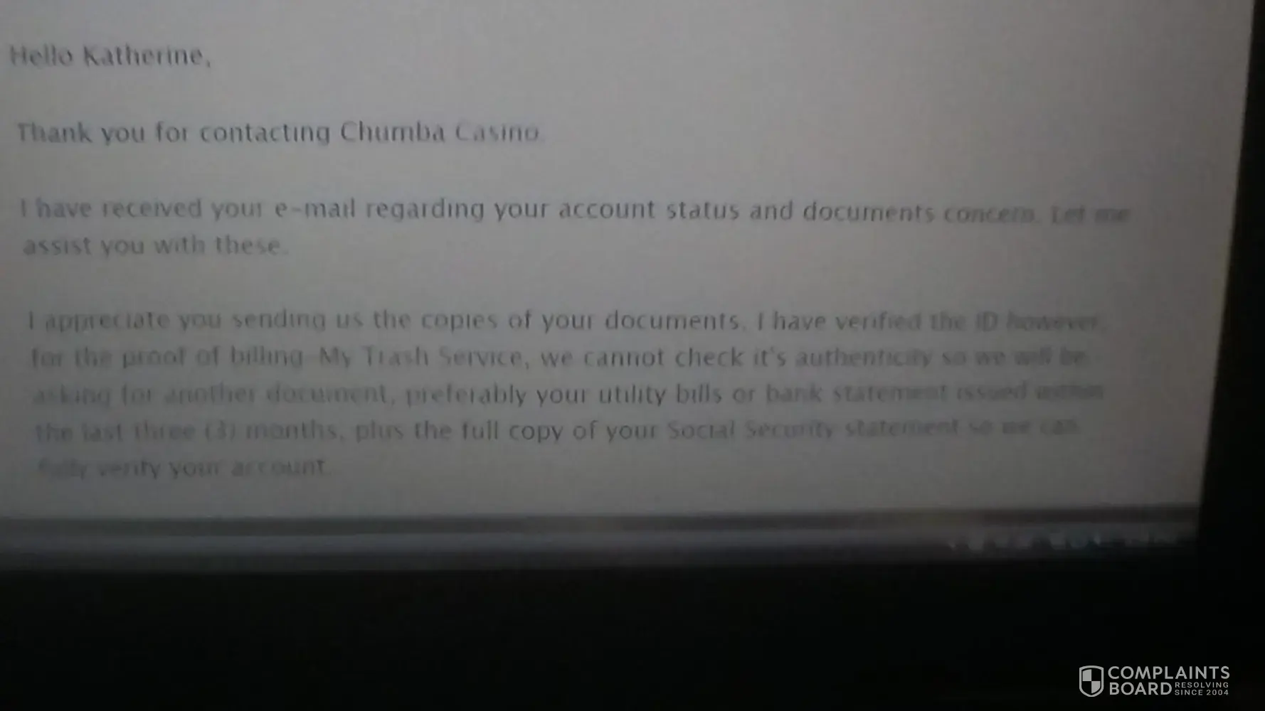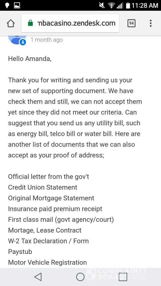 In November of 2017 I had won some sweeps cash $1, 000 that I requested to be cashed out on chumba Casino. After submitting several different documents that were told to me to be supported documents they're still arguing with me that I'm not meeting the requirements of my submitted documents for my cash out i have enclosed screen shots of a letter from a chumba casino support rep and the doc that was said to be a valid way to verify in the attachments below