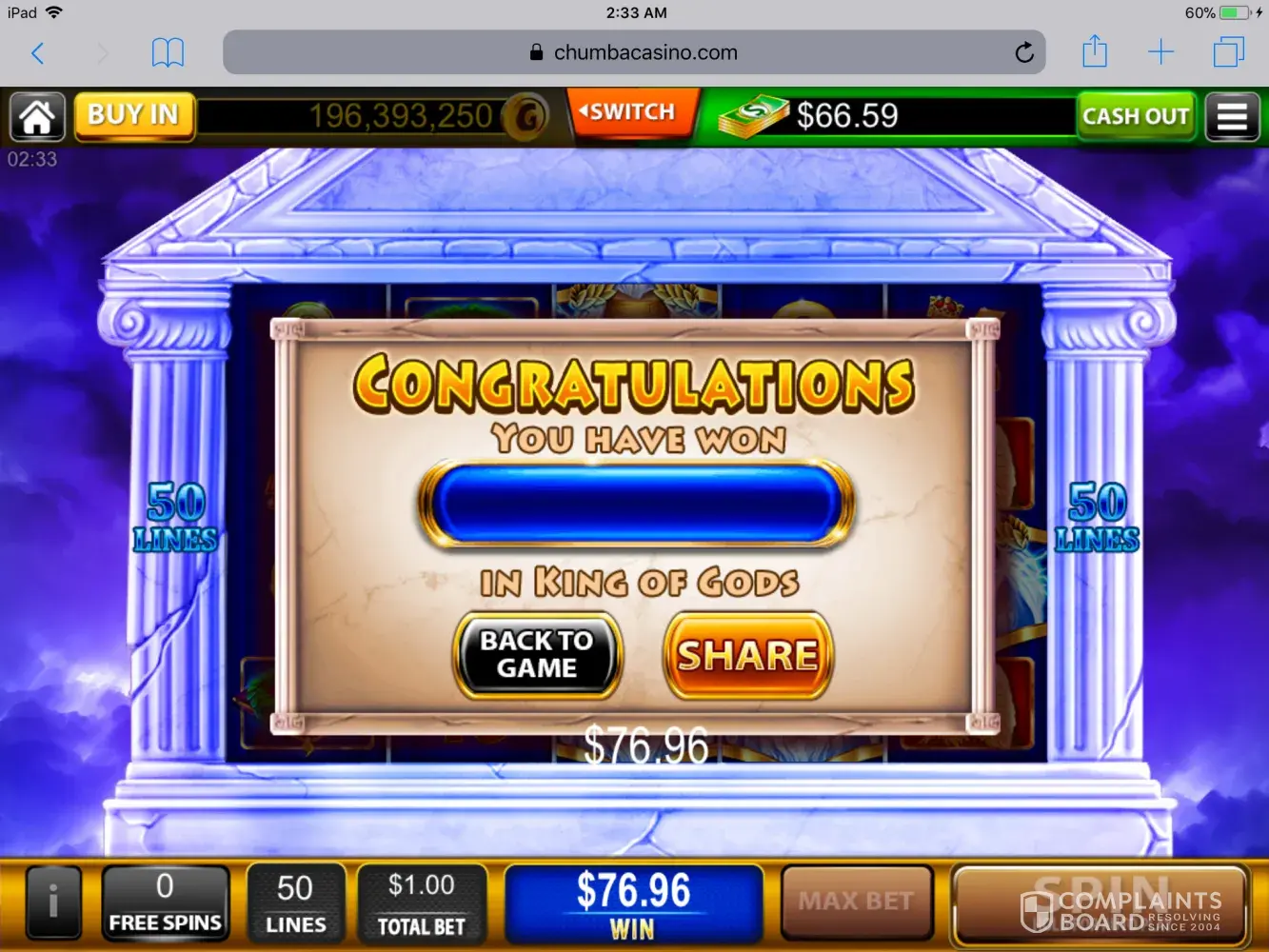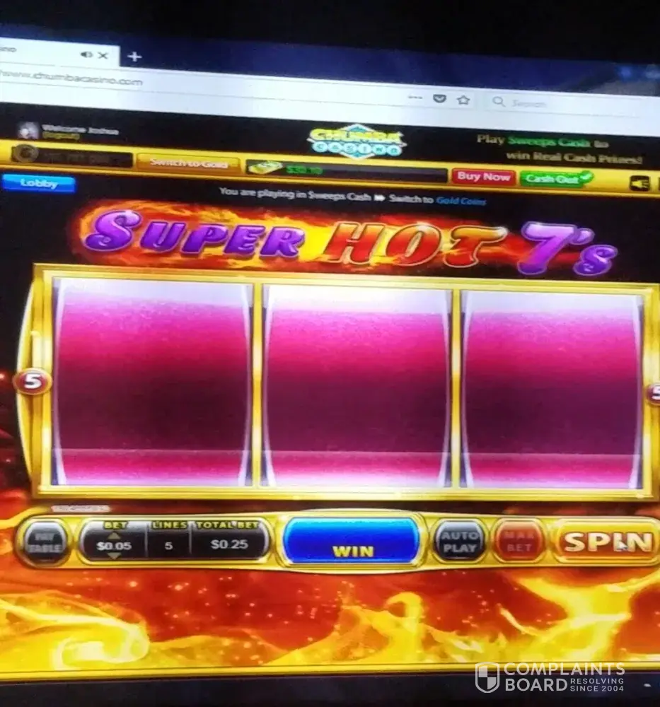 When you sign up, you are told you get $5 free sweepscash to try, and you can earn more or buy more, however I've tried to earn more and it's next to impossible because they offer a few bucks once or so each month for the first 10 or so people that like share and comment on their post, basically 1 in 600k or more odds, just for a few free bucks, and contrary to what they've supposedly claimed in the past and what many believe, there is no way to get free sweepscash or even gold coins to play on a daily or regular basis, you have to pay for it all after you run out of the starter funds. And at first, they may even send you maybe two or more promotion offers via email, you can buy, just to get you back spending on their games, after that, you are likely to not ever get anymore offers once they think they have you cornered to spend all your money on them. Because I've only ever gotten 2 offers and no more every again, so far. And in the past several days, I've lost just over $1000usd. With no cash outs. Their payout is a scam, you might bet $1.00usd and win 0.5cents on most spins, sometimes even .25cents, and when you finally do win something good, it's starts to stop winning and dwindle down every spin. It's basically a hook, line, and sinker game. I've lost so much based on games glitching, and even at one point, I hit the triple wild jackpot 3 times in super hot 7s, and it didn't payout. and when I contacted them with the date, time, and balance of when glitch started, they said their info shows a different date and balance. And that was with the screenshots of one of the times I hit triple wild jackpot and it glitched and dropped down making it not a winner, and video proof I also sent them. I've contacted them via the chumba support email, Facebook message, and Facebook community message. I which in Facebook community or page comments, they claim they will resolve it once I contact them in private, so that other players won't see whats really going on. I've sent them screenshots, multiple video clips of glitches, showing me betting and the reels kept glitching out and disappearing every few seconds, and they just give me the run around, and despite the fact that when sending a video via Facebook message, it is always viewable by the recipient, they still claim they can't view the video. I mean it is an addictive game, and one does expect to loose a bit, but this is far over stretching it by scamming people, real casinos have better odds. and another one of their tactics I've encountered lately is when you've been playing at least an hour and you finally get a good hit on a spin, a notification pops up, suggesting a break, and when you click no break, it resumes the game on a new spin, so you basically lost whatever you might have won. Another tactic I've encountered a few times now, was at one time when I hit bonus round in the big goreela and, when I finally hit free spins at $1.00 bet in king of gods, as well as when I hit a jackpot on another slot game of theirs, a pop up comes up saying server has to reload or something like that. And when it reloads, it says they updated their terms of agreement and you have to agree to continue, and when you do, you start over, like you never hit the free spins or jackpot. And based on other complaints I've read, they just give people the run around, and have lame excuses for everything. I think they should be shut down, and forced to reimburse those who lost and never cashed out anything.